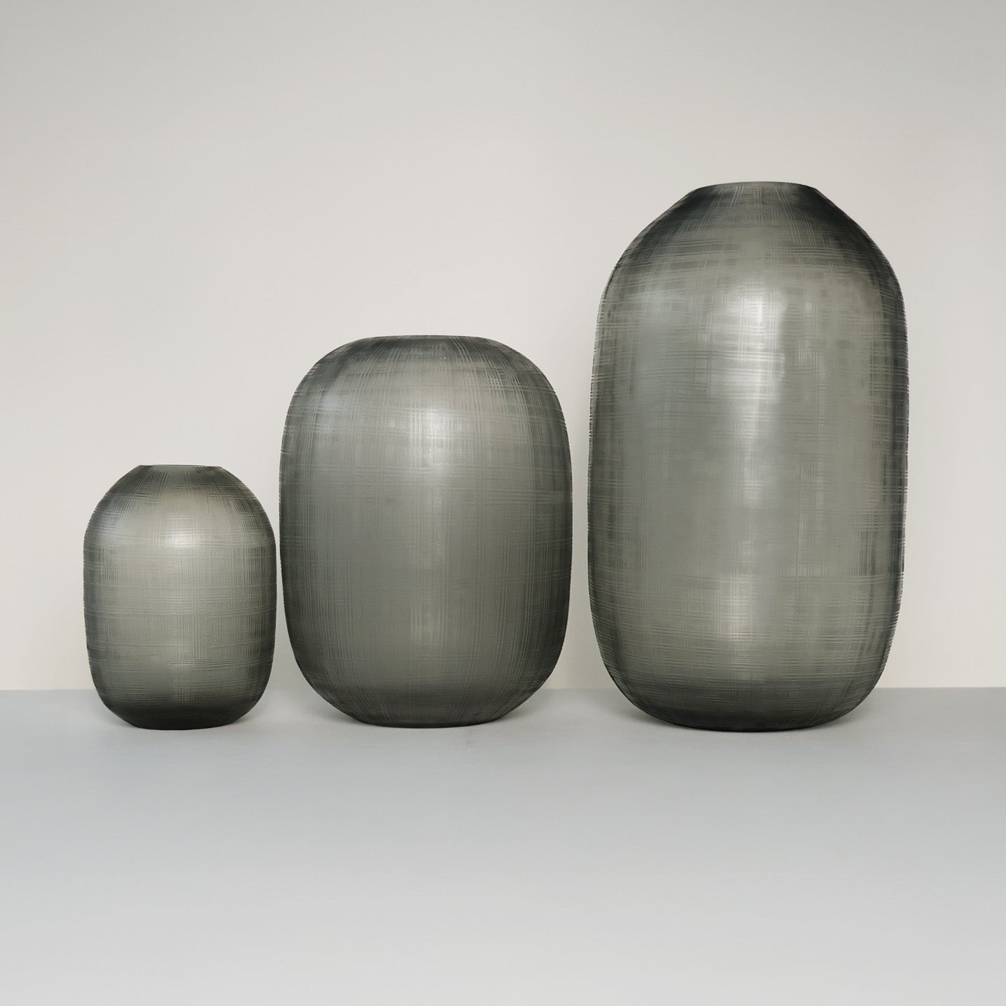 Crafted in sleek glass with a refined steel grey finish, this vase features delicate vertical line cuts that add subtle texture and depth. Its minimalist silhouette complements modern interiors, whether styled with florals or displayed as a standalone accent.