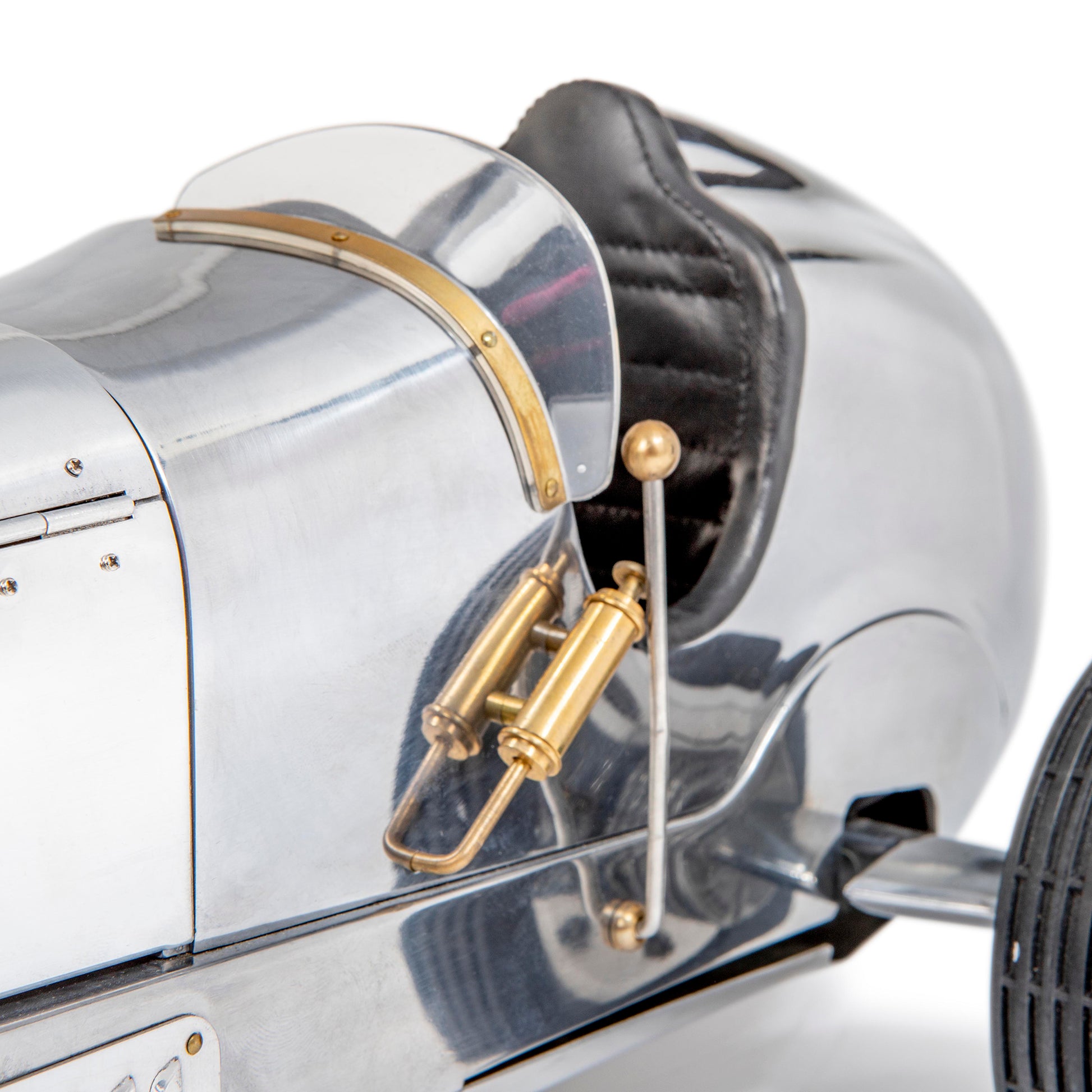 Technically skilled enthusiasts of the 1930s loved to race the legendary B.B. Korn cars around the club tracks. Called tether cars or spindizzies, they reached incredible speeds, and inspired thousands to improve and invent. The founder of the B.B. Korn Manufacturing Company, Barney Korn, produced several tether car models that now, as vintage antiques, achieve astounding sums at auction. For the children of his clients Mr. Korn designed and built “The Indianapolis,” a non-powered pre-war giveaway. It was meant to enthuse children and get them to participate in motoring activities. Our Indy ‘toy’ car pays homage to Korn’s legacy with detailed dash, rubber tires, and hand-polished aluminum body.