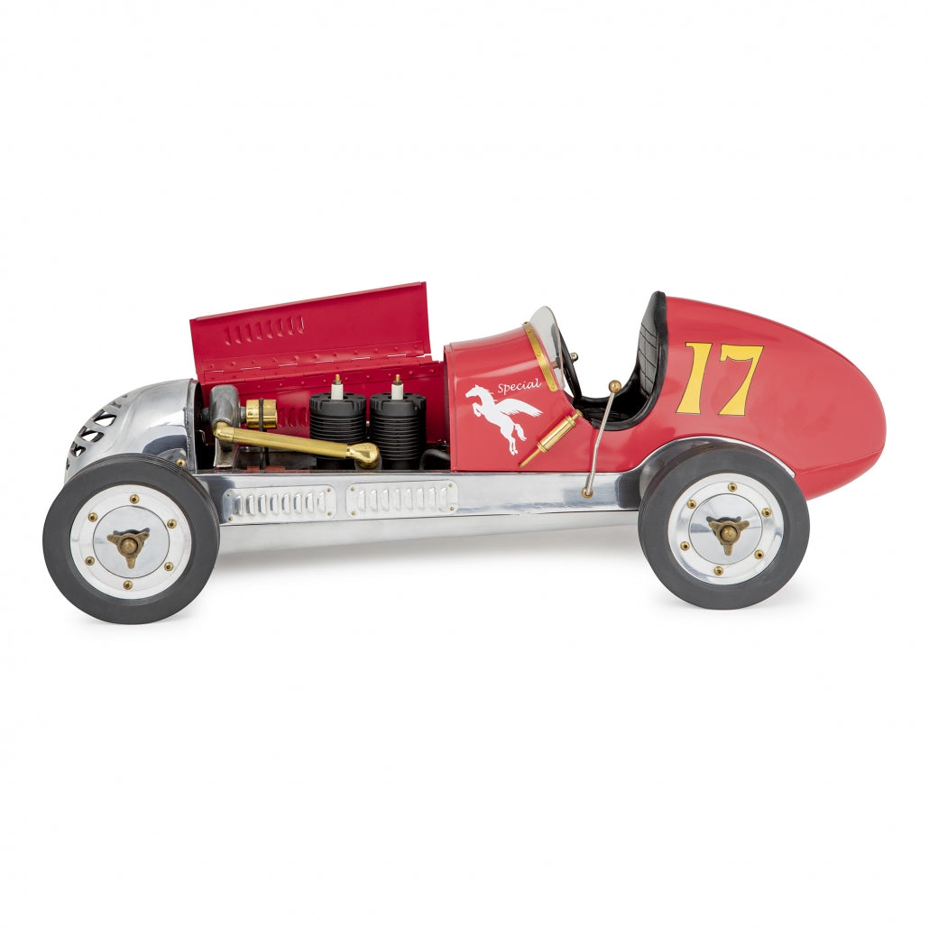 Technically skilled enthusiasts of the 1930s loved to race the legendary B.B. Korn cars around the club tracks. Called tether cars or spindizzies, they reached incredible speeds, and inspired thousands to improve and invent. The founder of the B.B. Korn Manufacturing Company, Barney Korn, produced several tether car models that now, as vintage antiques, achieve astounding sums at auction. For the children of his clients Mr. Korn designed and built “The Indianapolis,” a non-powered pre-war giveaway. It was meant to enthuse children and get them to participate in motoring activities. Our Indy ‘toy’ car pays homage to Korn’s legacy with detailed dash, rubber tires, and hand-polished aluminum body.
