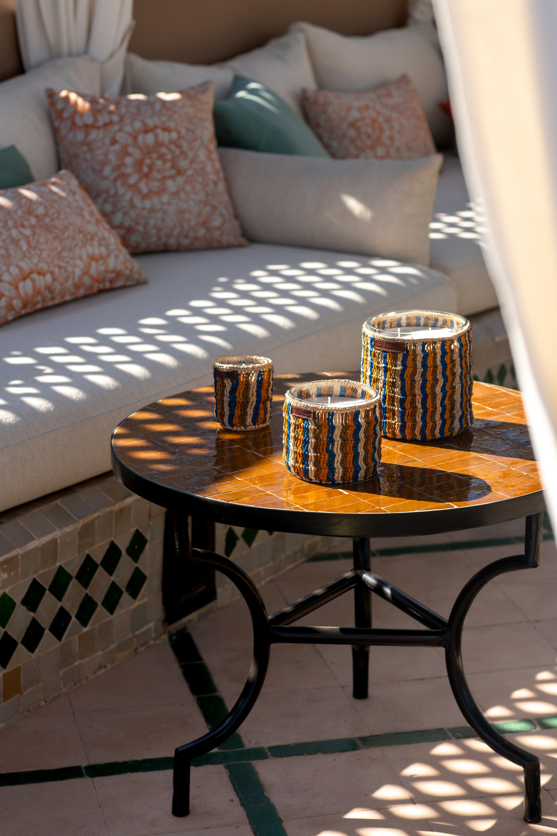Scented candle dressed in handwoven raffia by a women’s cooperative in Essaouira.