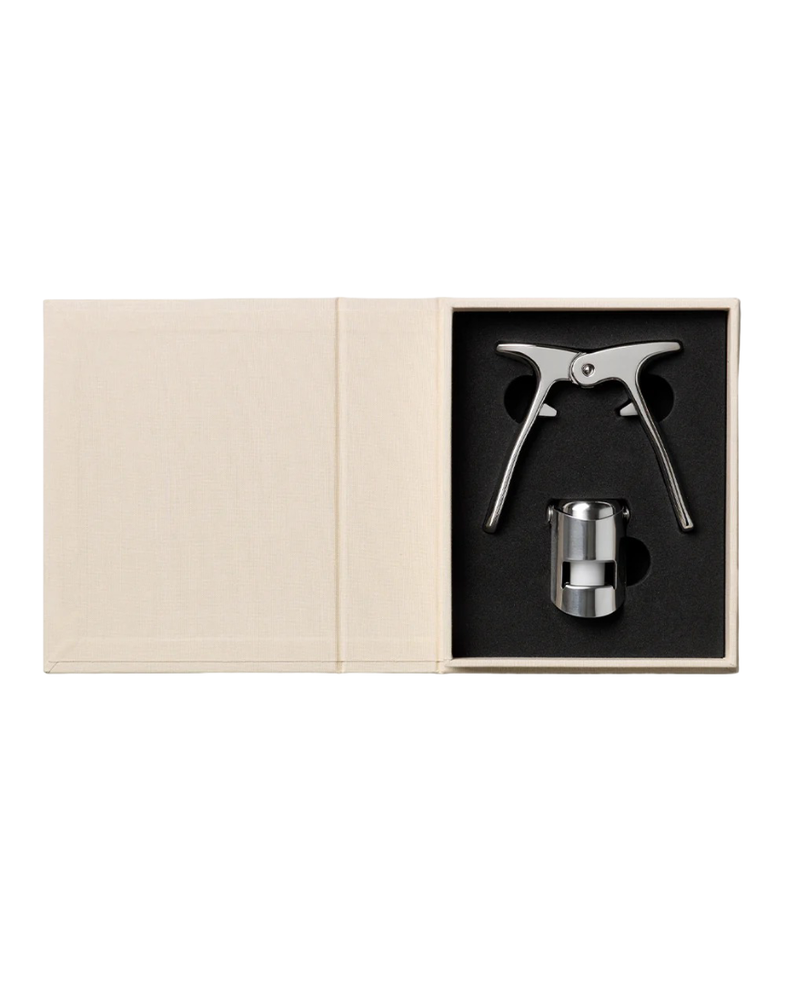 Discover our exclusive Champagne Kit, elegantly presented in a stylish, book-like box. Inside, you’ll find all the essential tools for celebrating in style. When not in use, this kit makes a charming addition to your kitchen decor, standing proudly alongside your favorite recipe books.