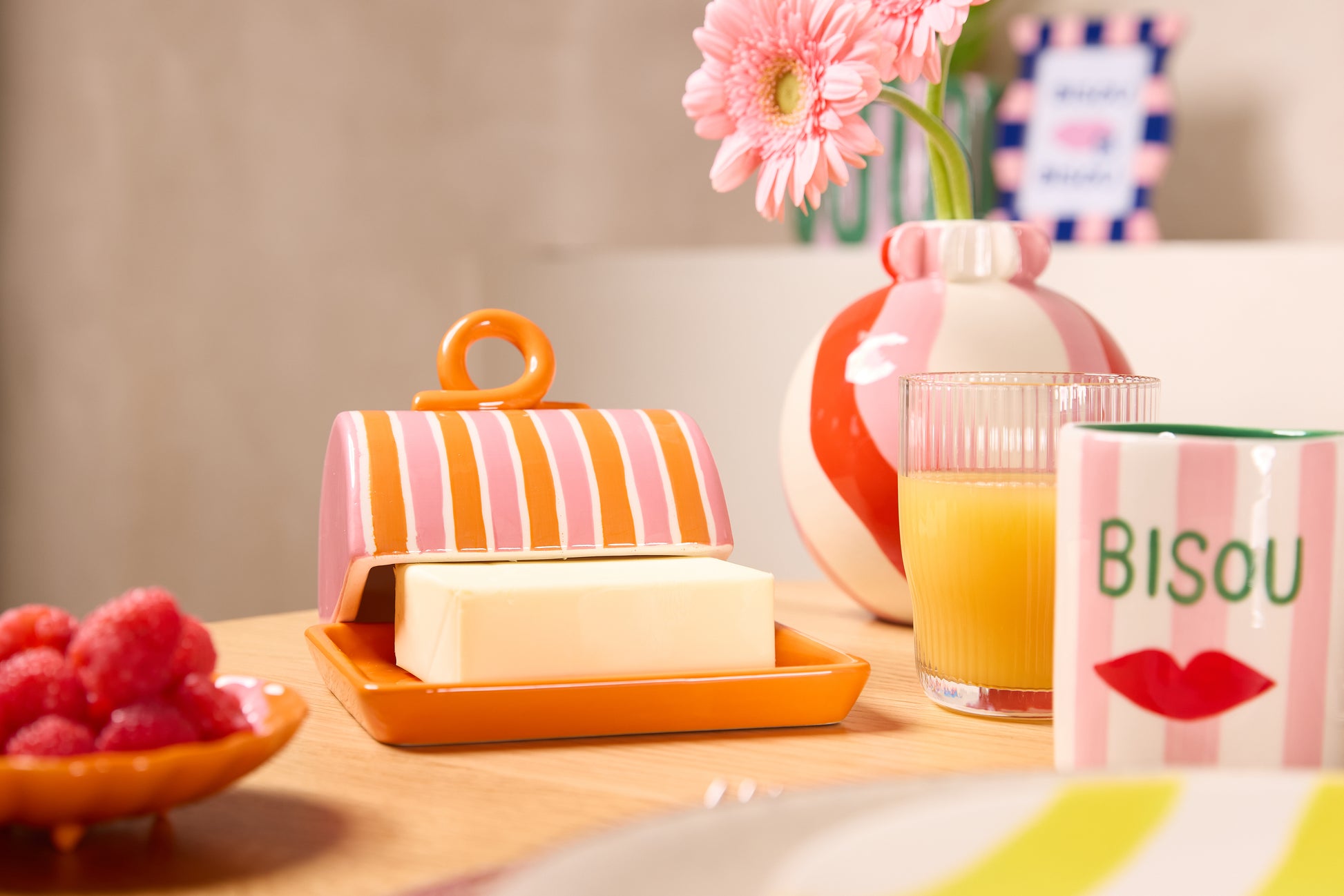 Serve your butter in style with the Qué Rico ceramic Emilio butter dish. Inspired by the sunny Spanish lifestyle, this dish features the bright Rayas Bailarinas pattern in pink, white and orange, that adds a pop of colour to your table. Each butter dish is hand-painted, perfect for those who appreciate uniqueness in their kitchenware. Gift packaging included.