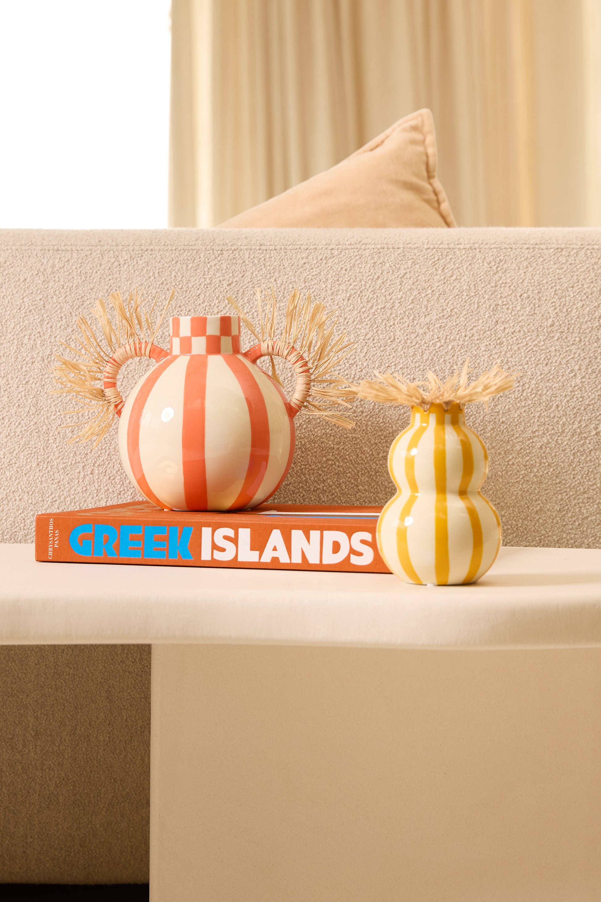 Enhance your floral display with the ceramic Esperanza vase from Qué Rico. This Belgian-designed vase, inspired by the lively Spanish lifestyle and featuring our Rayas Bailarinas pattern, adds a ray of sunshine to your home. With its organic shape, raffia finishing and yellow striped pattern, this handmade vase is a true eye-catcher in any interior. As it is hand-painted, every piece is unique! Gift packaging included.