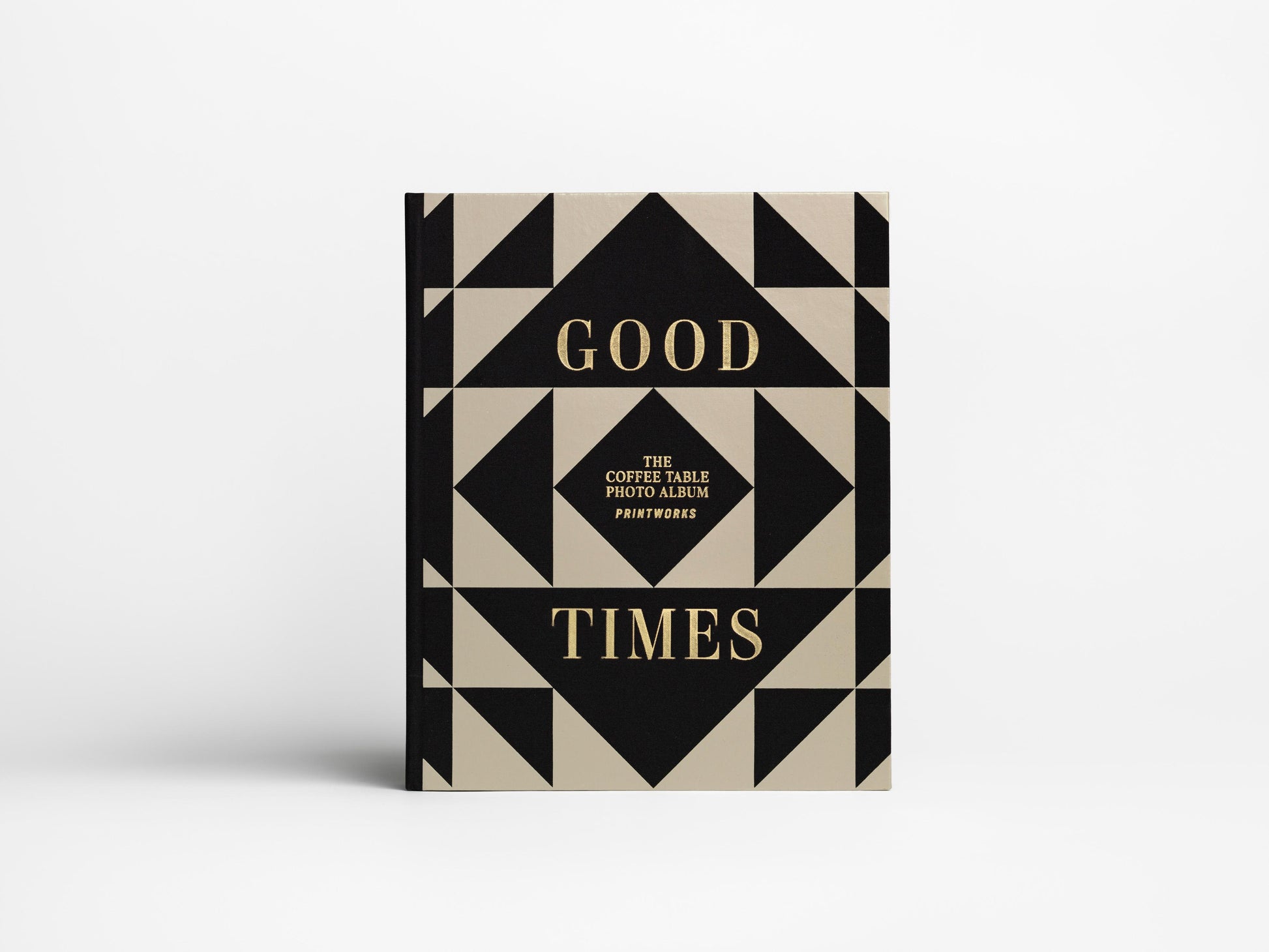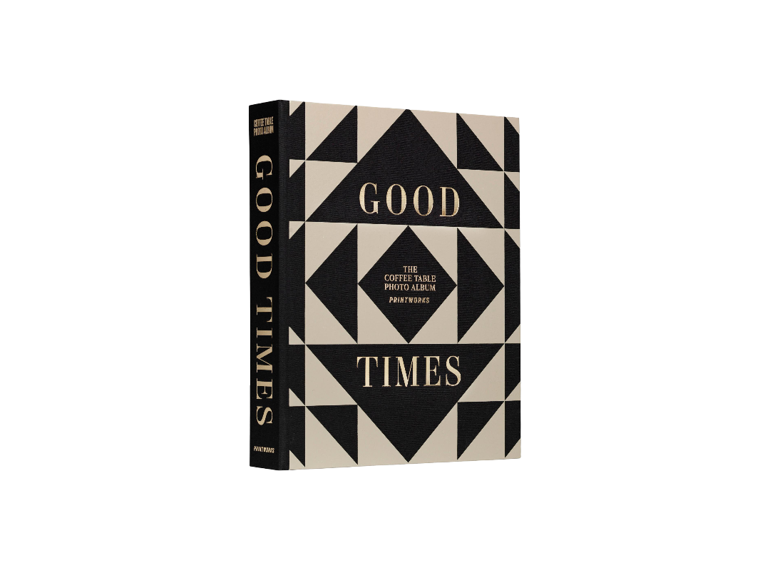 Discover our Good Times - Triangles coffee table photo album, featuring an elegant, beige and black cloth cover with gold foiled text.