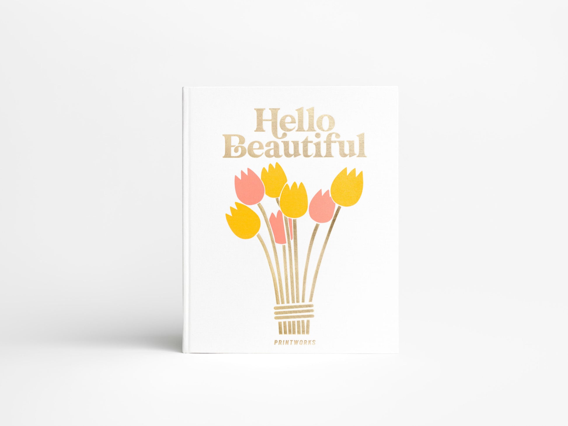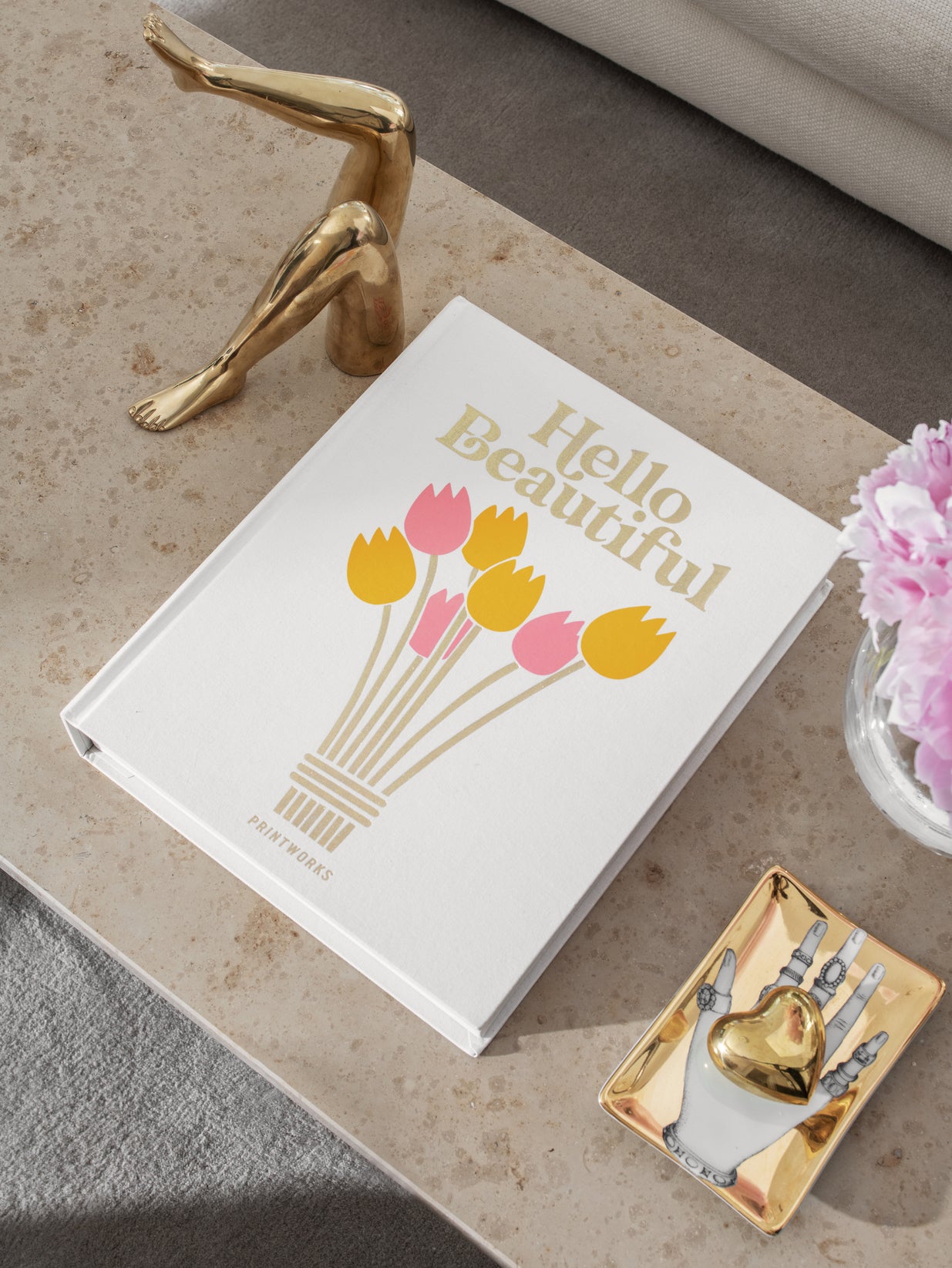 Discover our Hello Beautiful coffee table photo album, featuring an elegant, white cloth cover with gold foiled text and silkscreen printed tulips in pink and orange.