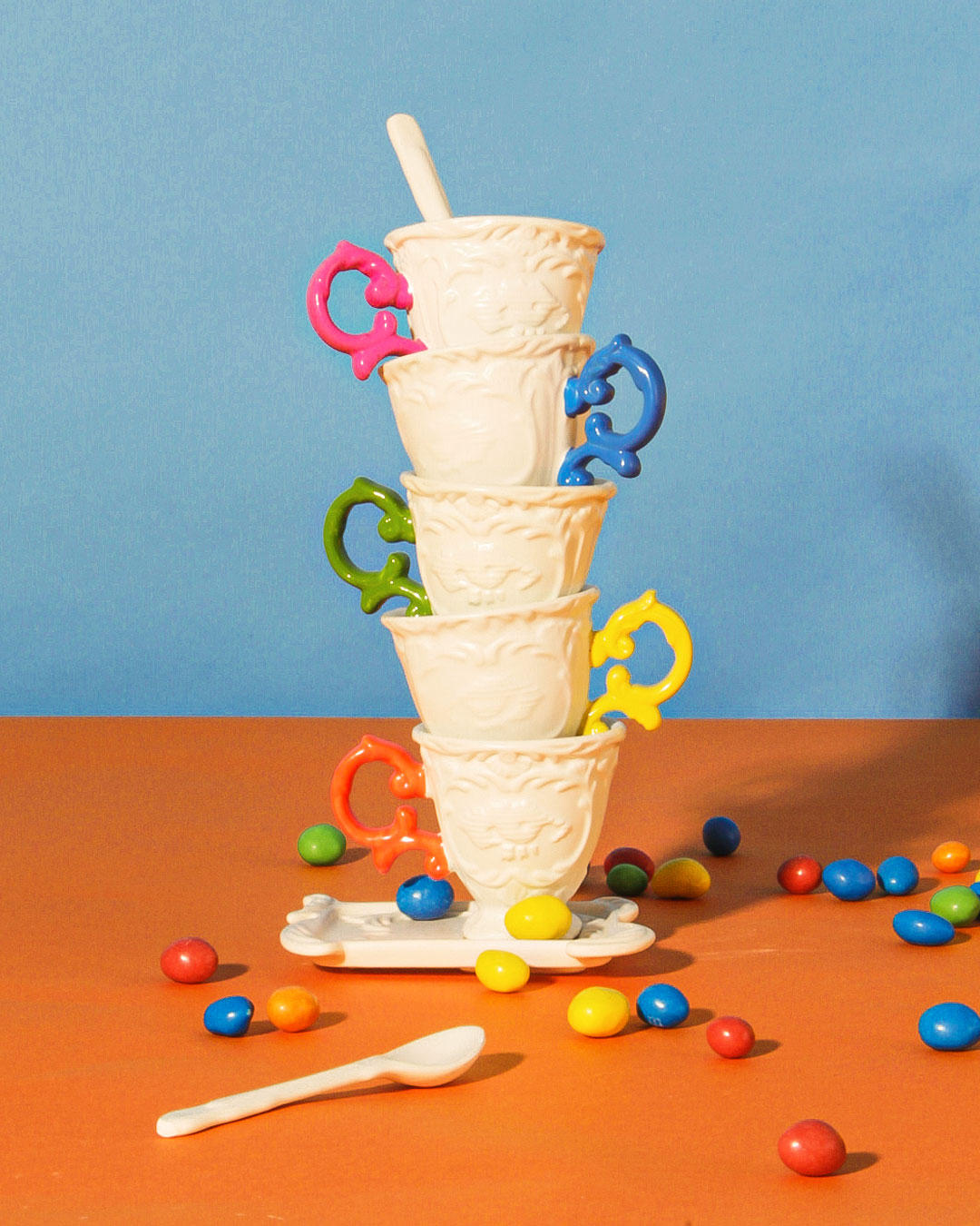 Mugs, tea and coffee sets with a baroque inspiration. Fine opaque porcelain with mat white finishing and fluorescent coloured handles. Brilliant and elegant, the new gold glossy finishing gives to the collection a new sophisticated way of living.