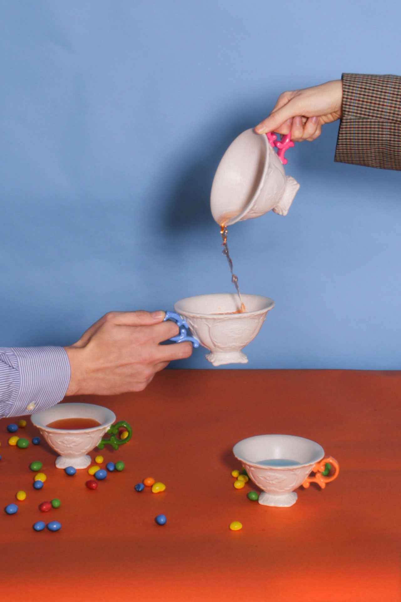 Mugs, tea and coffee sets with a baroque inspiration. Fine opaque porcelain with mat white finishing and fluorescent coloured handles. Brilliant and elegant, the new gold glossy finishing gives to the collection a new sophisticated way of living.