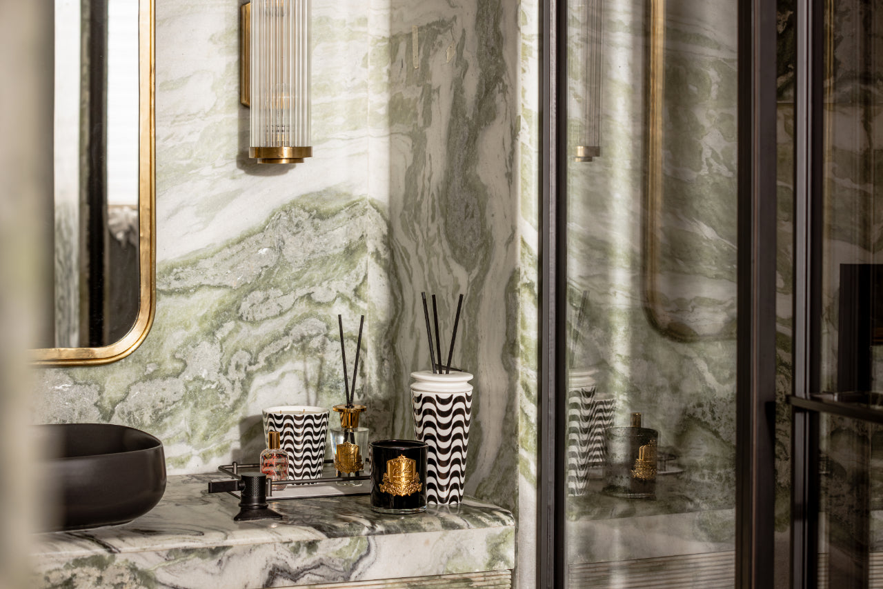 The elegant waves adorning the home fragrance container, decorated with a golden border, symbolize the diversity and cycle of life. The fragrance of Latin waves takes the mind to a rustling and surging sea, where splashes of water bring a fragrant gust of air, full of citrus freshness, cardamom and pepper warmth while musk and amber sensuality create an exclusive, cozy atmosphere in your home.