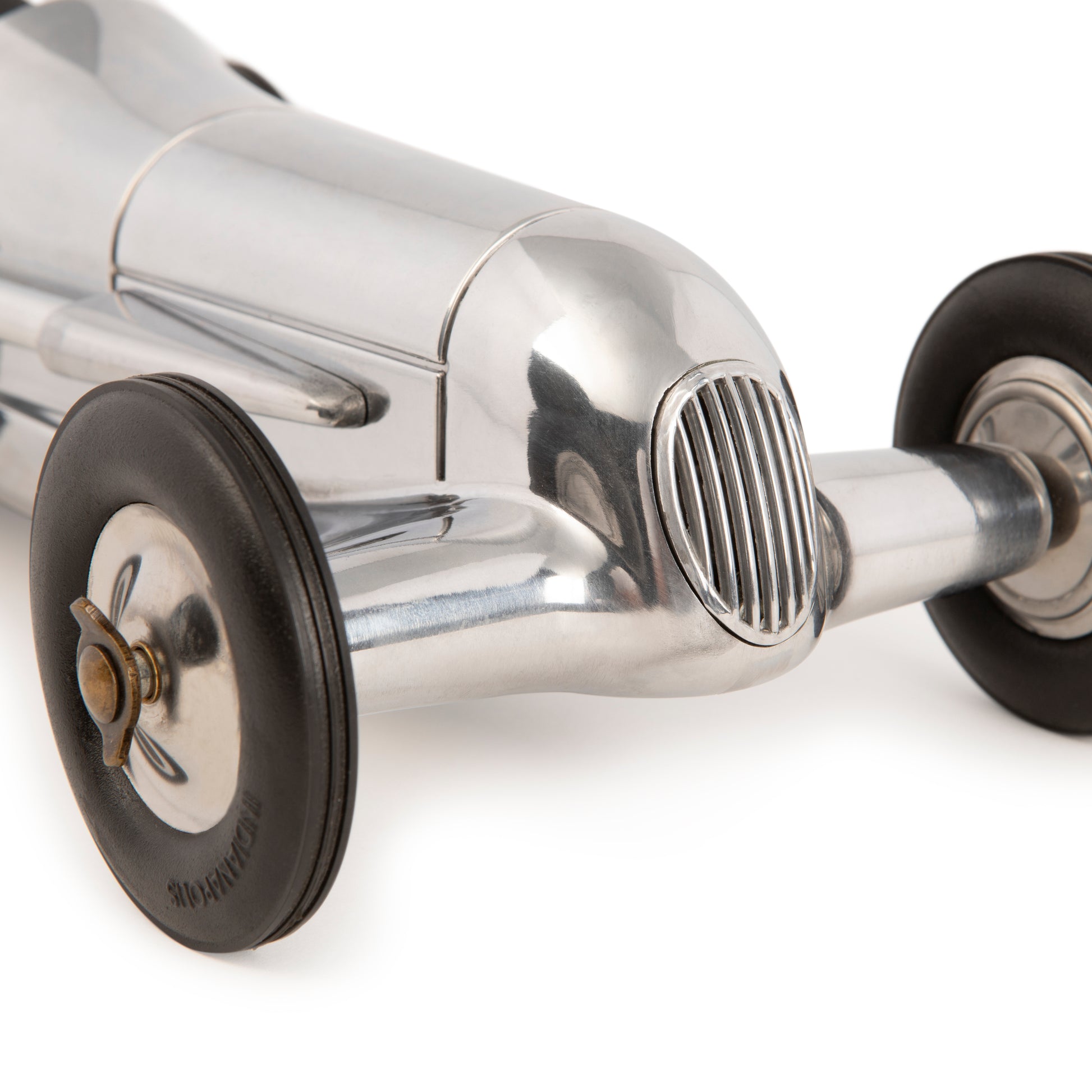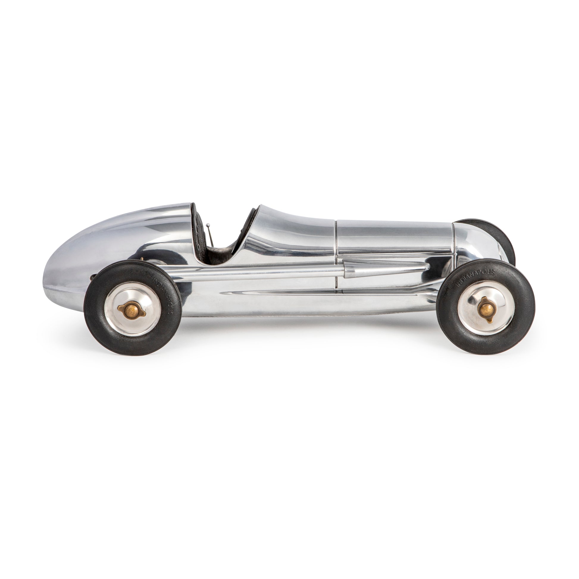 Its original makers were the famous Dooling Brothers, who manufactured around 1000 units at the time. They were offered to aficionados of the famous Dooling spin-dizzies, miniature motorized racecars that reached dizzying speeds. They were closely modeled on the famous Mercedes Silver Arrows of the early 1930s. Originals are now rare and highly prized by collectors. Molded with the same exacting detail as its original, our 12.2″ Indy racer is hand-cast in airplane aluminum. Hand polished and buffed to a high shine, it features a detailed dashboard, faux leather seat, steering wheel and brake. In keeping with its original model-toy character, the front wheels are not linked to the steering wheel. The wheel hubs and rubber tires are made with the same exact detail as the original. Enjoy a truly unique piece of Grand Prix history. This shiny, sleek desktop racer represents both the romance and the dramatic beauty of the most famous Grand Prix racers ever!
