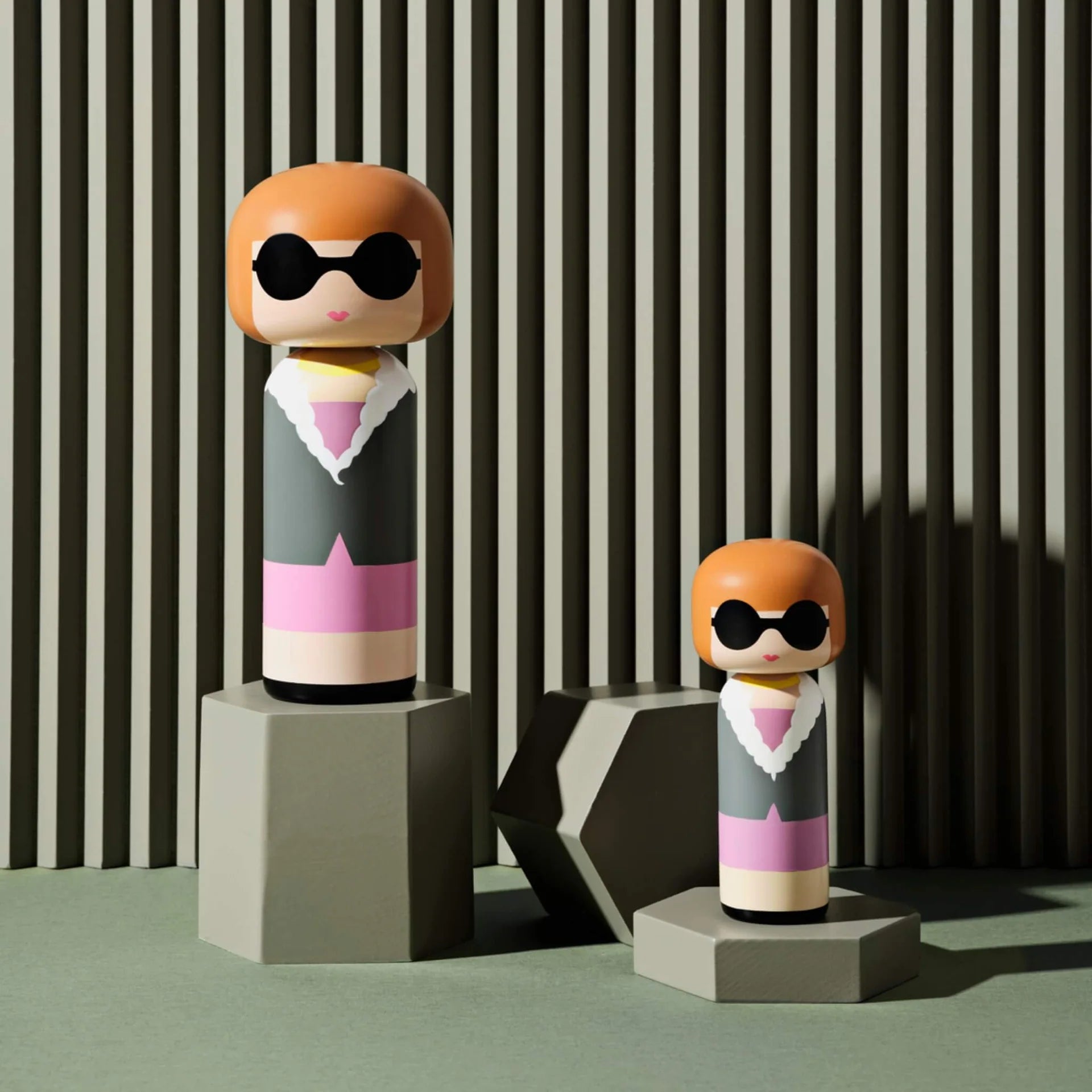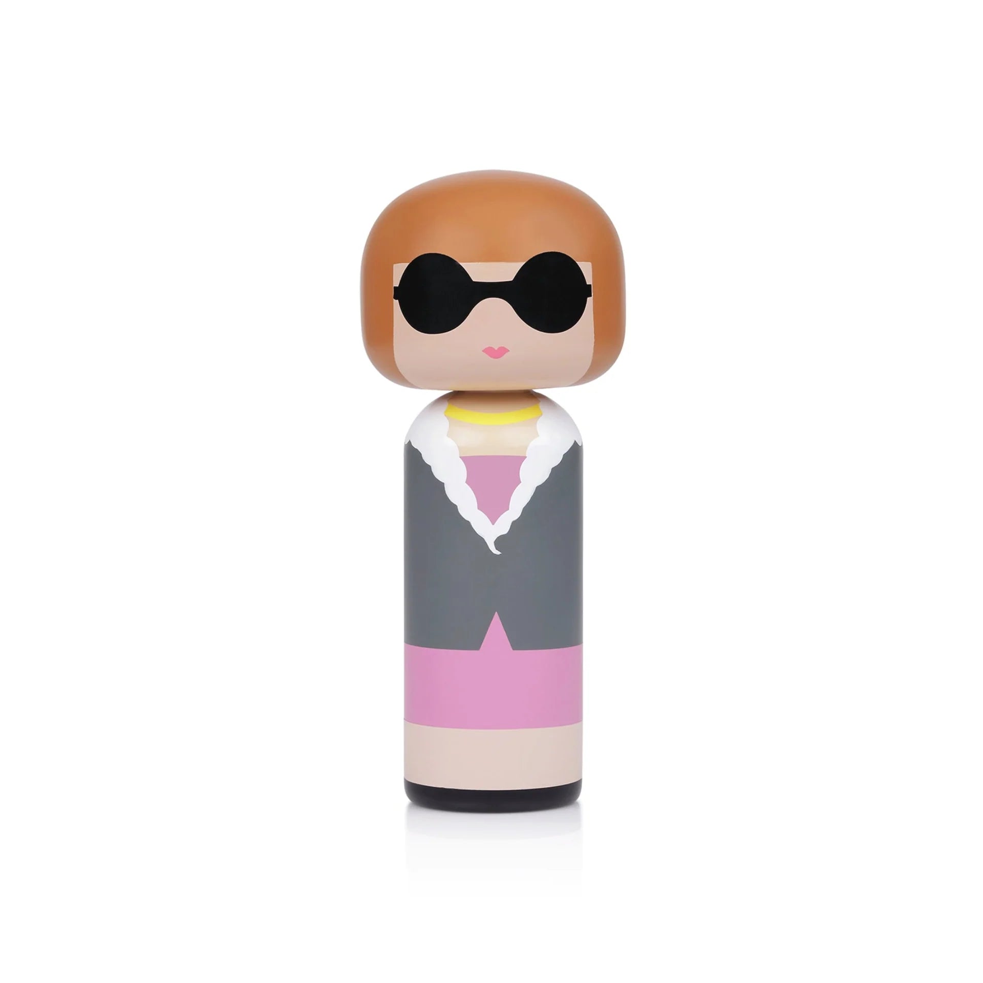 The Anna Kokeshi is a stunning and sophisticated wooden doll that pays homage to the iconic fashion editor-in-chief. Modern design with her signature bob haircut, black sunglasses, and a stylish suit jacket, all inspired by her impeccable fashion sense. The doll's design is a playful representation of Anna's iconic style and her influential role in the fashion industry.