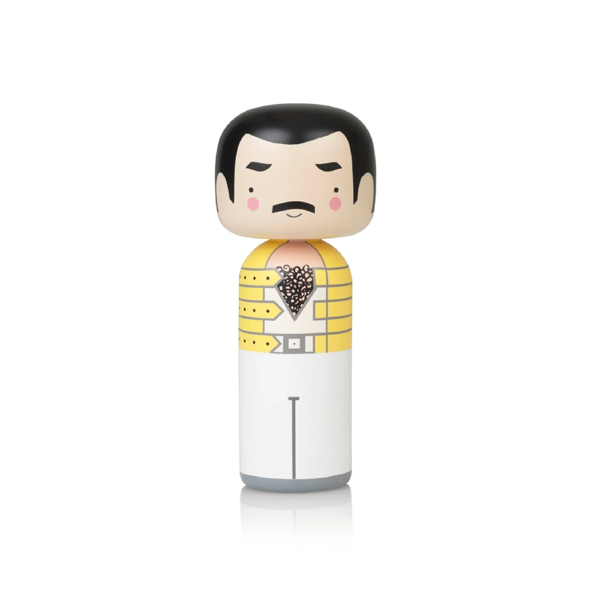 Freddie Mercury. one of the greatest rock legends in history. has left a significant impression on the world. His incredible vocal range combined with his flamboyant and theatrical personality. made him an artist in a league of his own. The design of the kokeshi doll is based on Freddie’s most iconic outfit; the yellow military jacket which he wore during the sold-out European “Magic” tour in 1986.