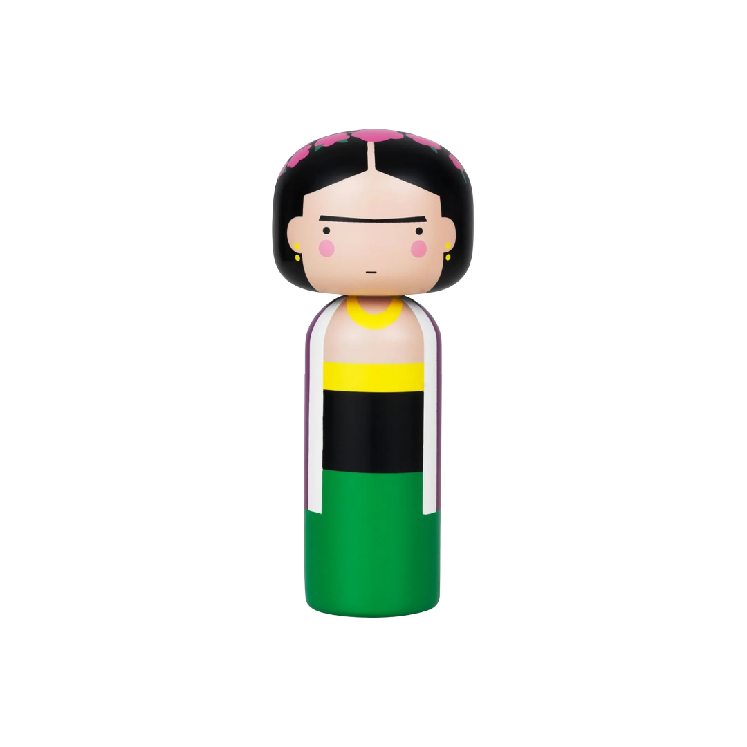 The Frida Kokeshi doll pays homage to the iconic Mexican artist. The Kokeshi features a striking design with a bold floral headdress, iconic unibrow, and a colorful dress inspired by the artist's self-portraits. The doll's design is a beautiful and playful representation of Frida's unique style and artistic vision.