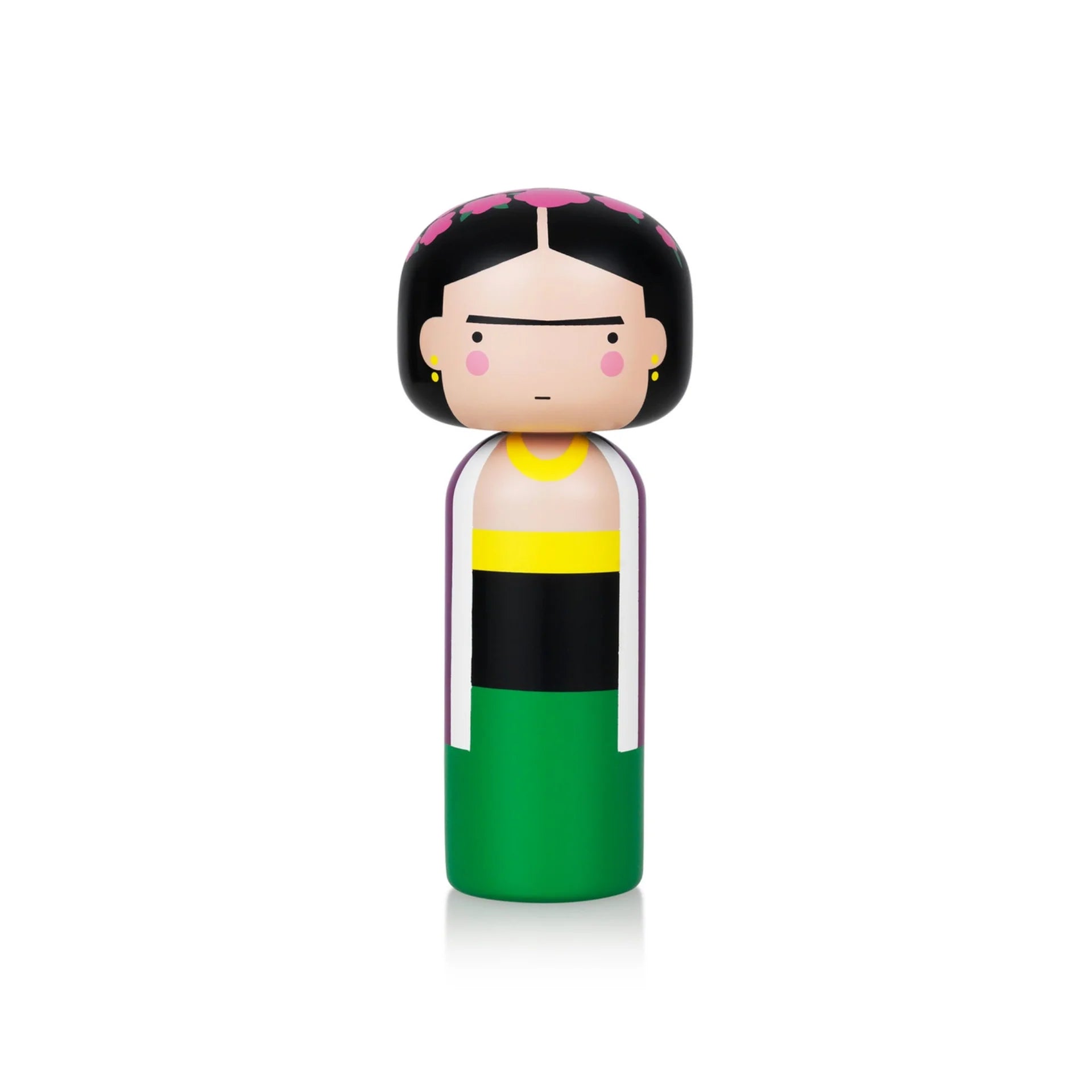 The Frida Kokeshi doll pays homage to the iconic Mexican artist. The Kokeshi features a striking design with a bold floral headdress, iconic unibrow, and a colorful dress inspired by the artist's self-portraits. The doll's design is a beautiful and playful representation of Frida's unique style and artistic vision.