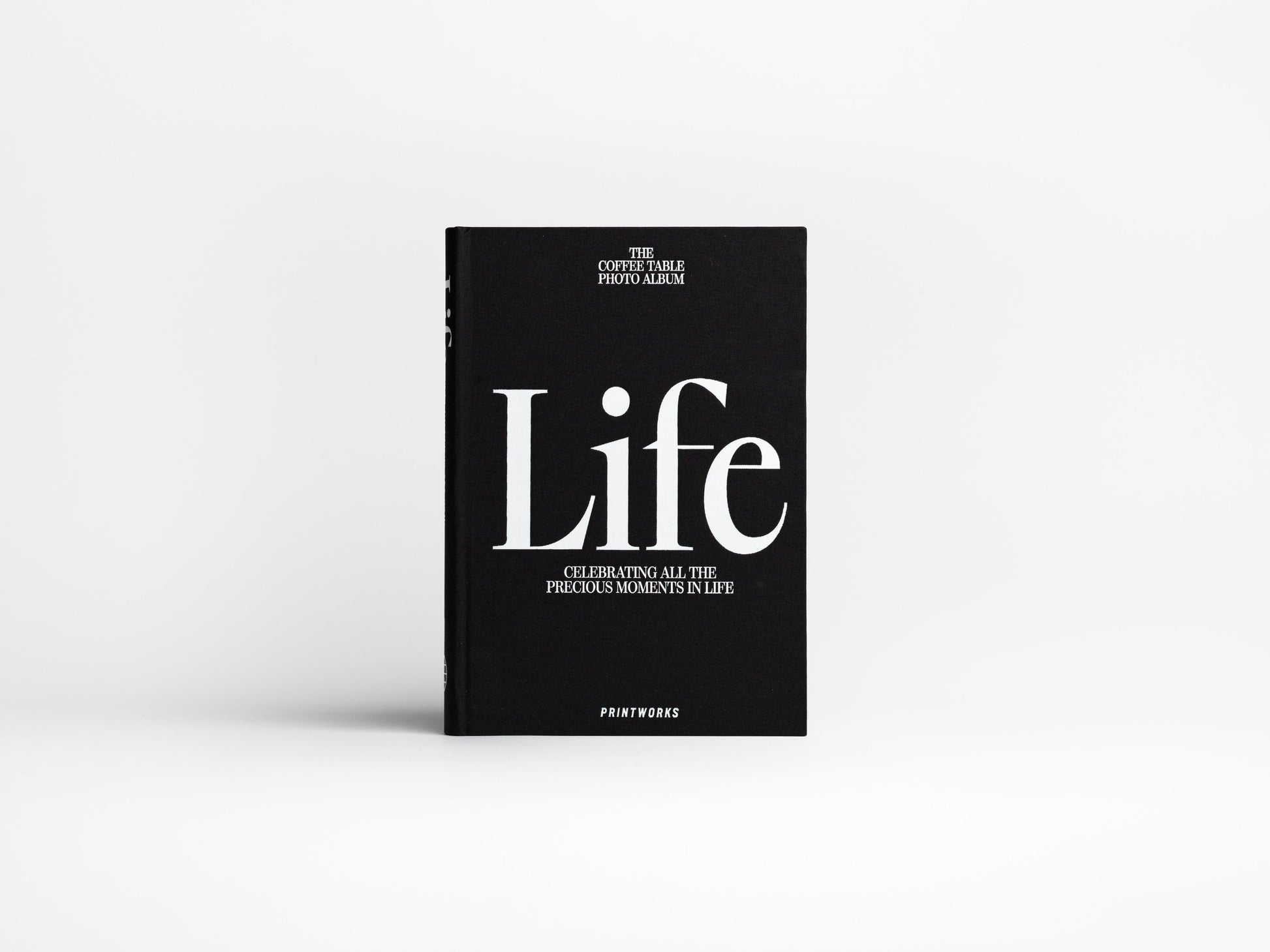 Discover our bestselling photo book Life, featuring a beautiful hardcover bookshelf design covered in black cloth with white text.