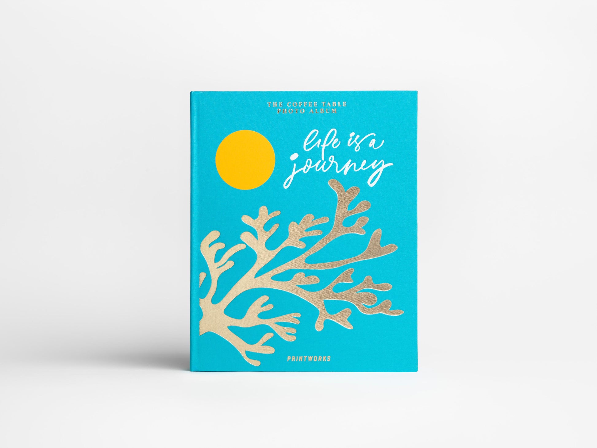 Discover our Life is a Journey coffee table photo album, featuring an elegant, turquoise cloth cover with white text.