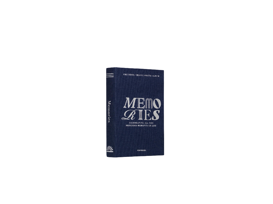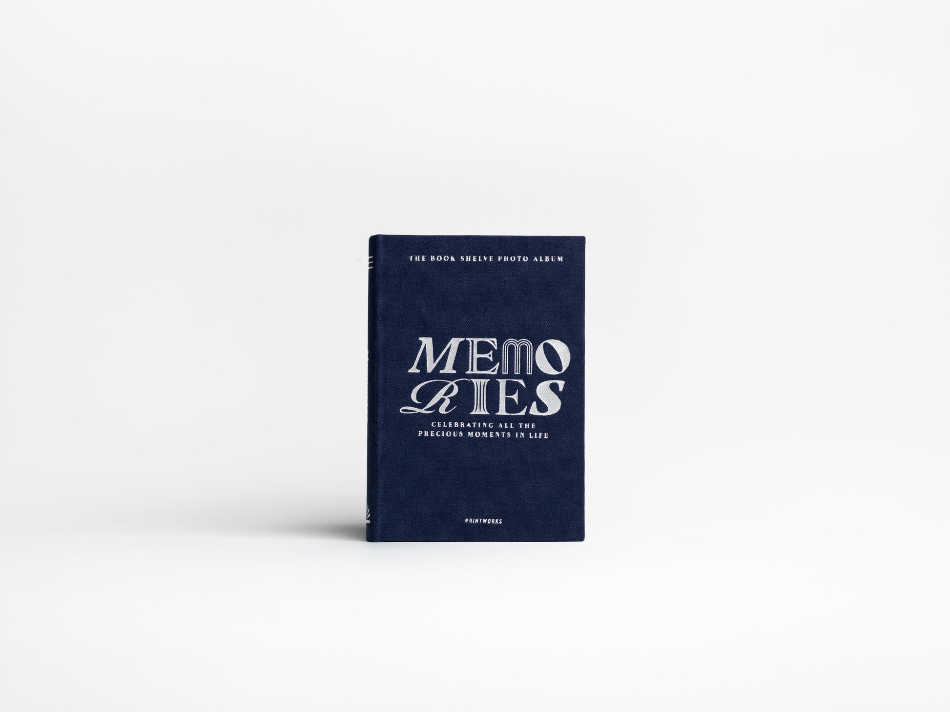 Discover our bookshelf album Memories, featuring a hardcover bookshelf design covered in dark blue cloth with white text – a stylish alternative to our traditional box-like coffee table photo albums.
