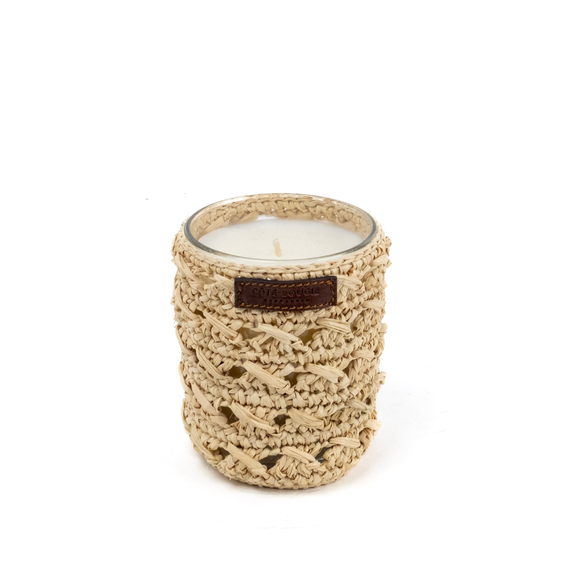 Scented candle dressed in handwoven raffia by a women’s cooperative in Essaouira