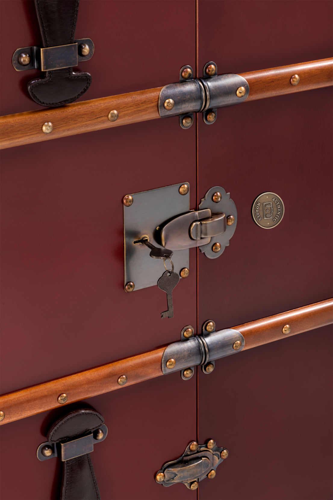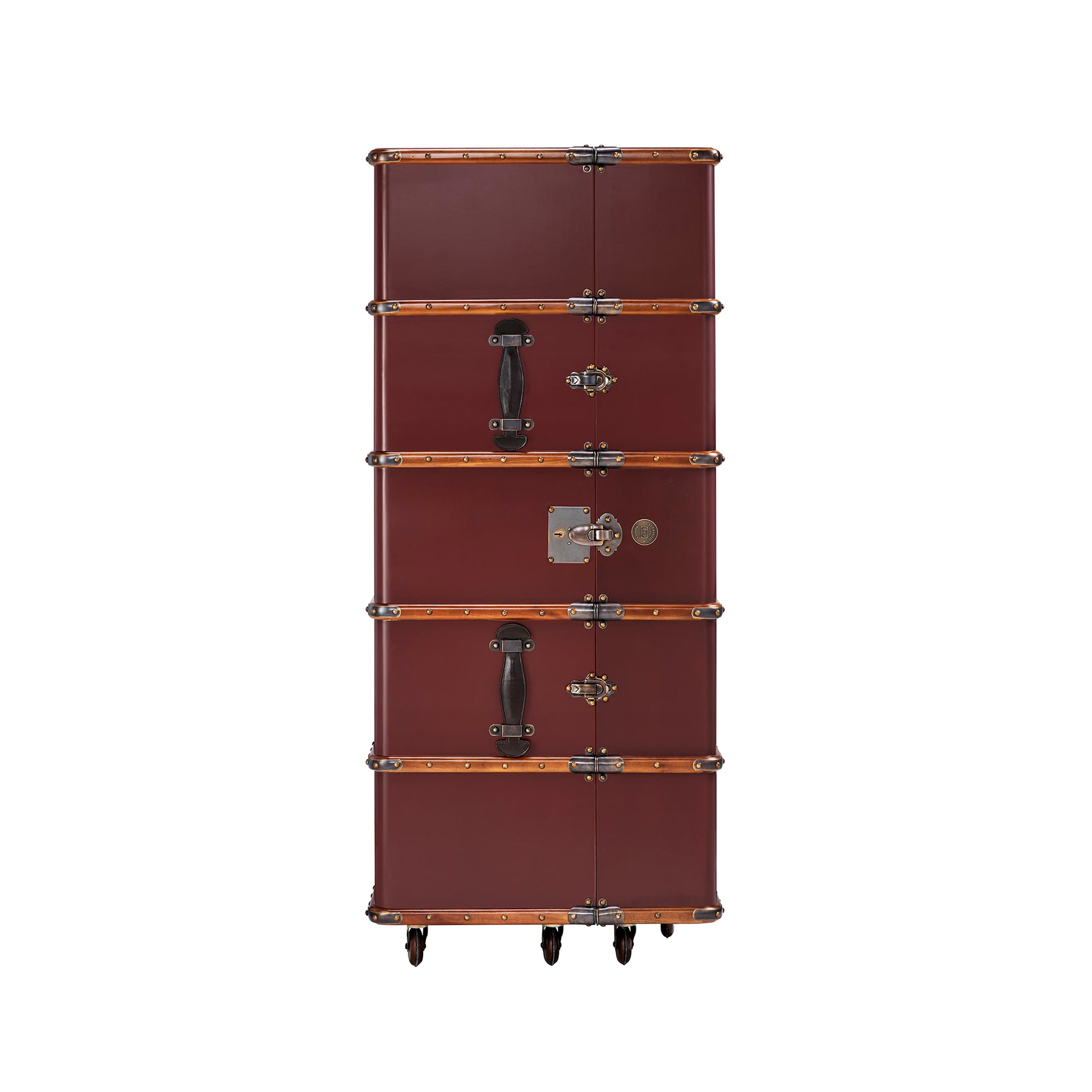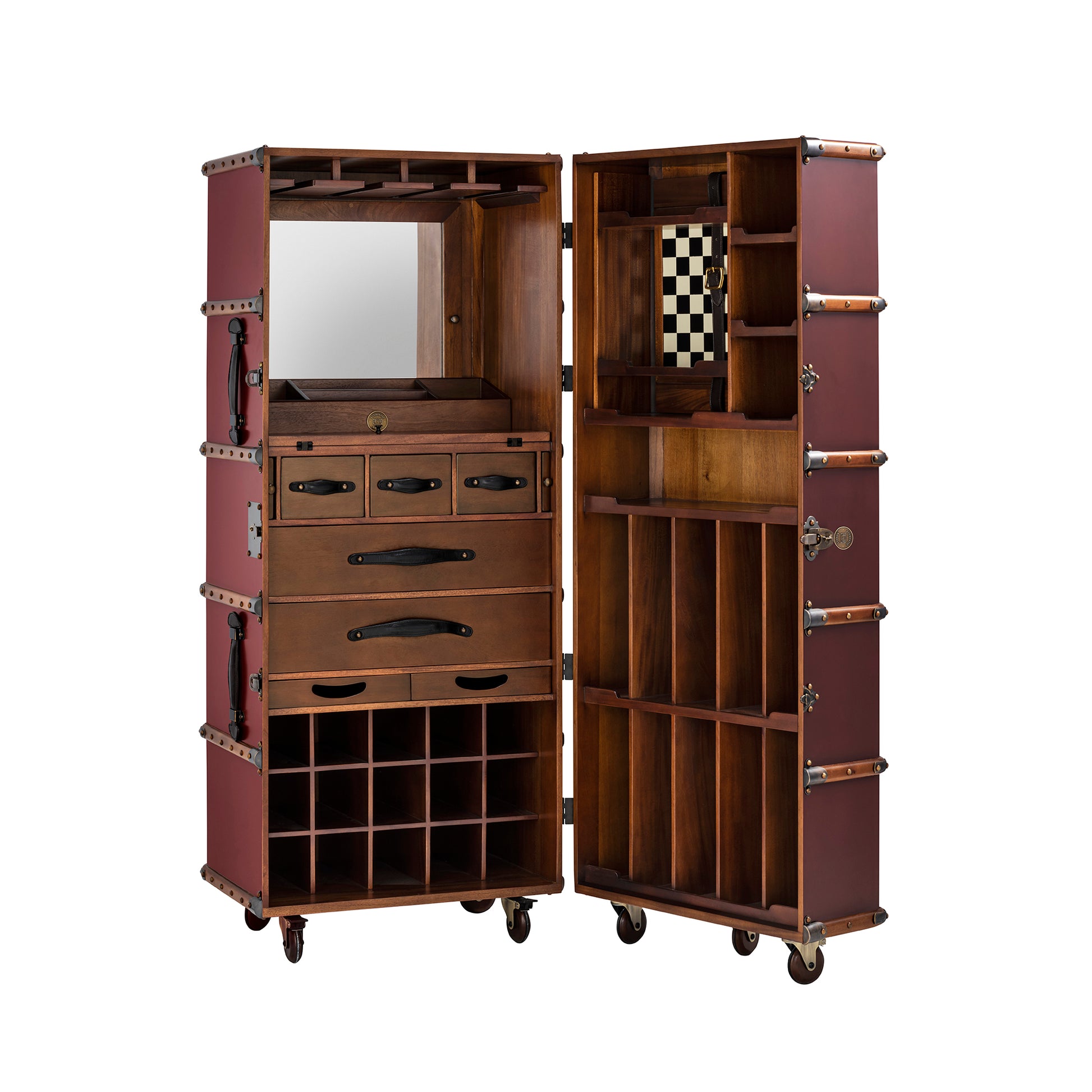 Fun and functionality coalescing into an impressive piece of historic proportions. Wheel in the bar. Park and lock it somewhere close at hand! Made in the style of turn-of-the-century travel trunks. Solid brass hardware and bridle leather accoutrements complete a hand-built, two-part bar inside a large trunk set on sturdy wheels. A multitude of drawers, two serving trays, racks for both horizontal and vertical bottles. Mirror and foldout work shelf. Taking out the shelf unit on the right frees up a removable game board. Iconic. Confidently evocative of the Belle Époque when a hunt required only a Martini or a whiskey sour at hand!