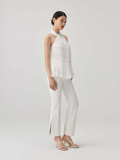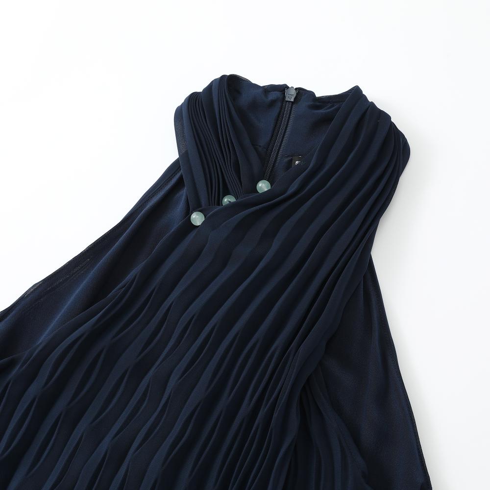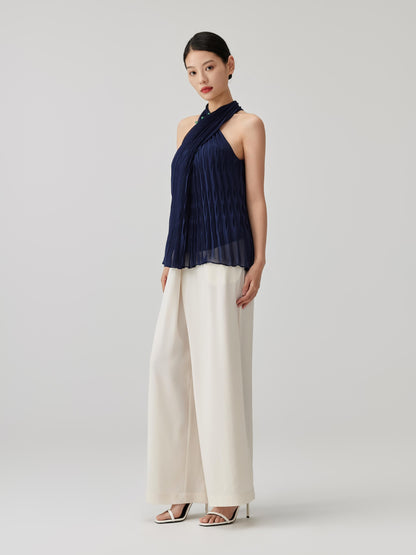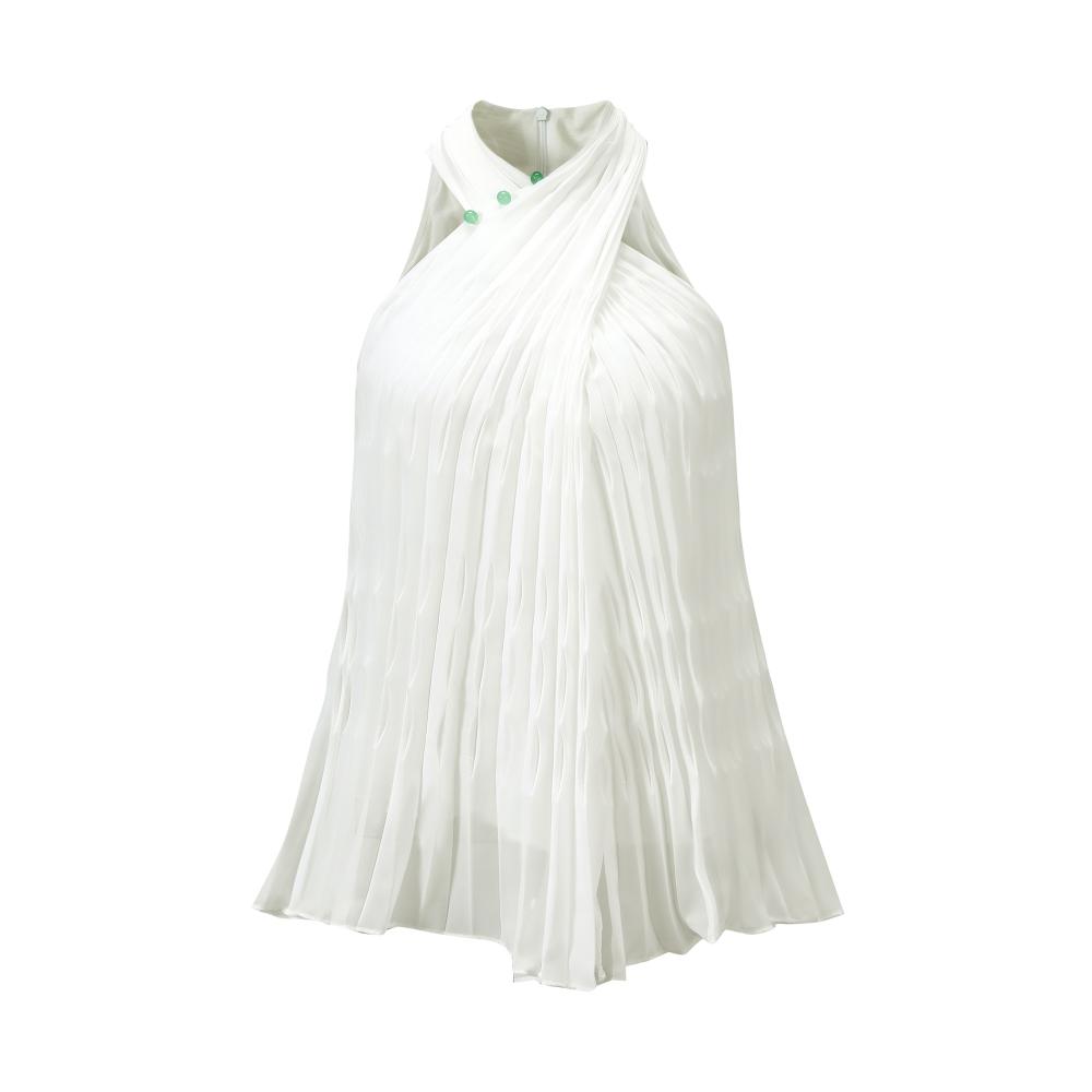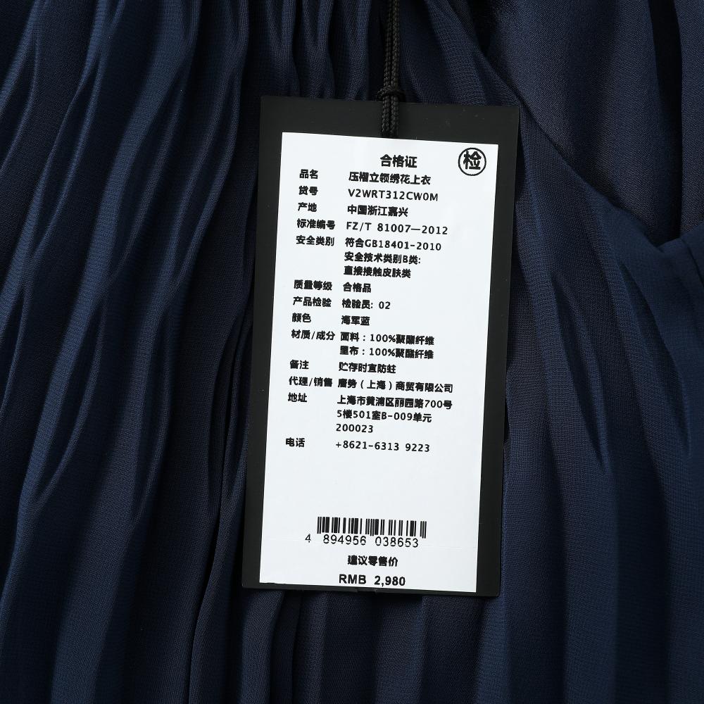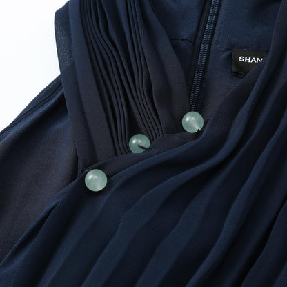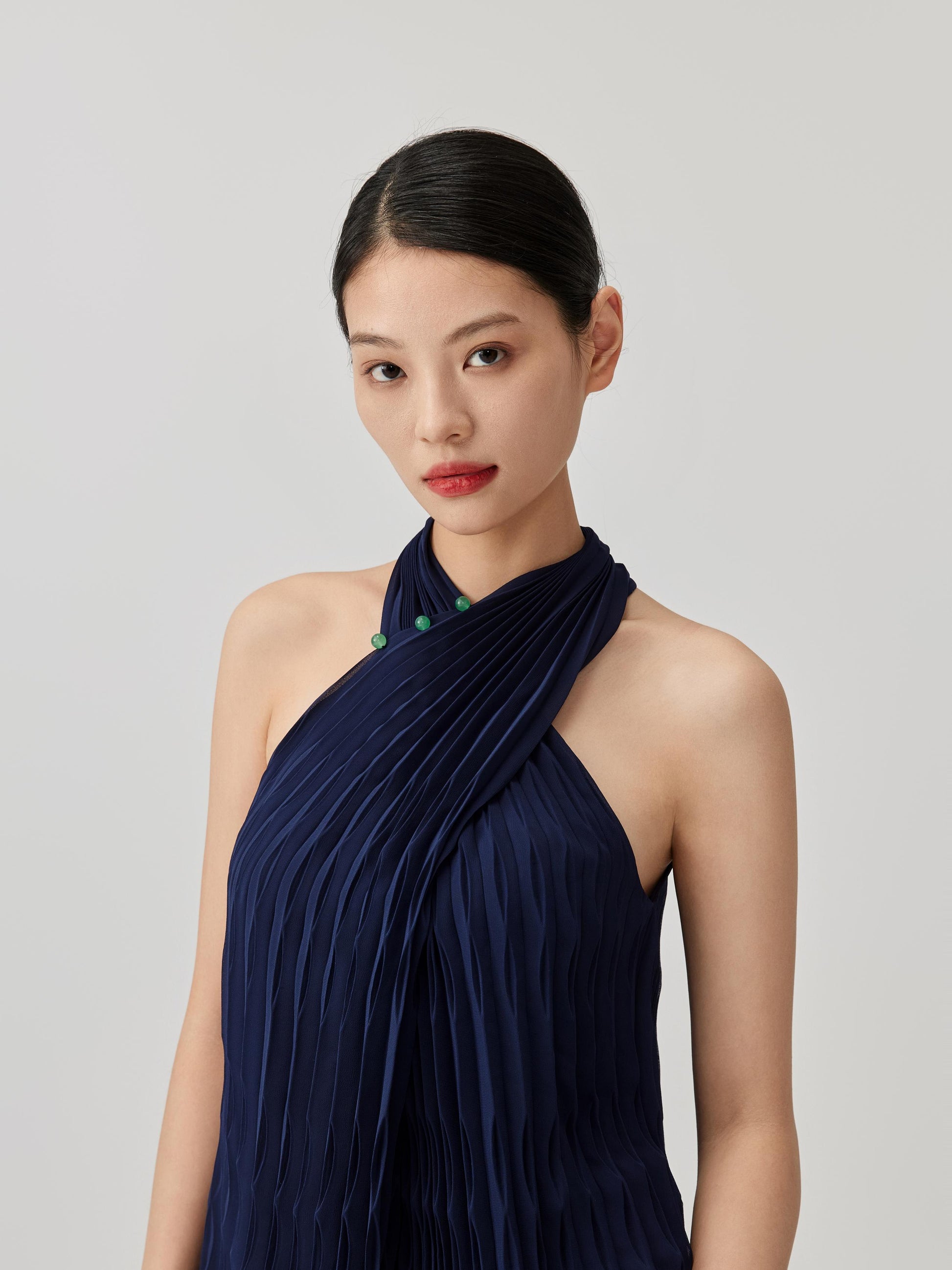 This navy pleated cross collar top by Shanghai Tang combines modern style with elegance. Crafted from 100% polyester, it features a distinctive pleated design and a chic cross collar, offering a contemporary touch. The lightweight fabric and flattering fit make it a versatile piece, ideal for both casual and semi-formal wear.