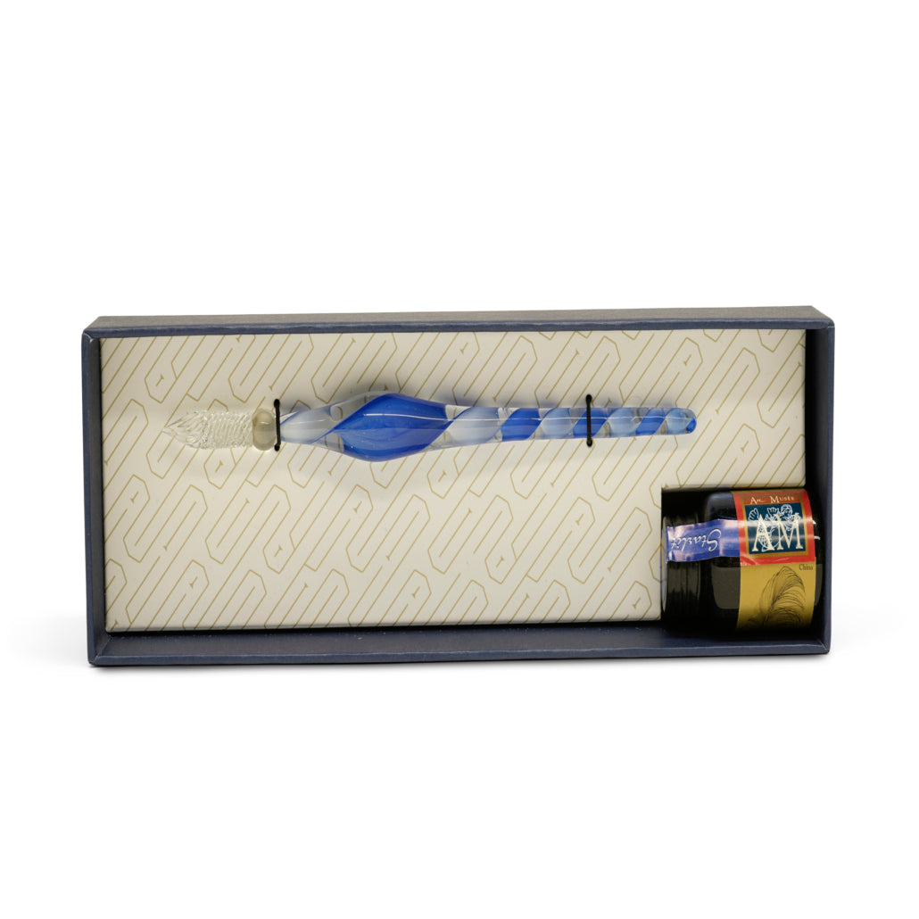 A handcrafted glass dip pen with a bold spiral design, inspired by Venetian artistry. Paired with a rich calligraphy ink, it makes a refined gift for writing lovers. Elegant and functional, it's a timeless desk accessory.