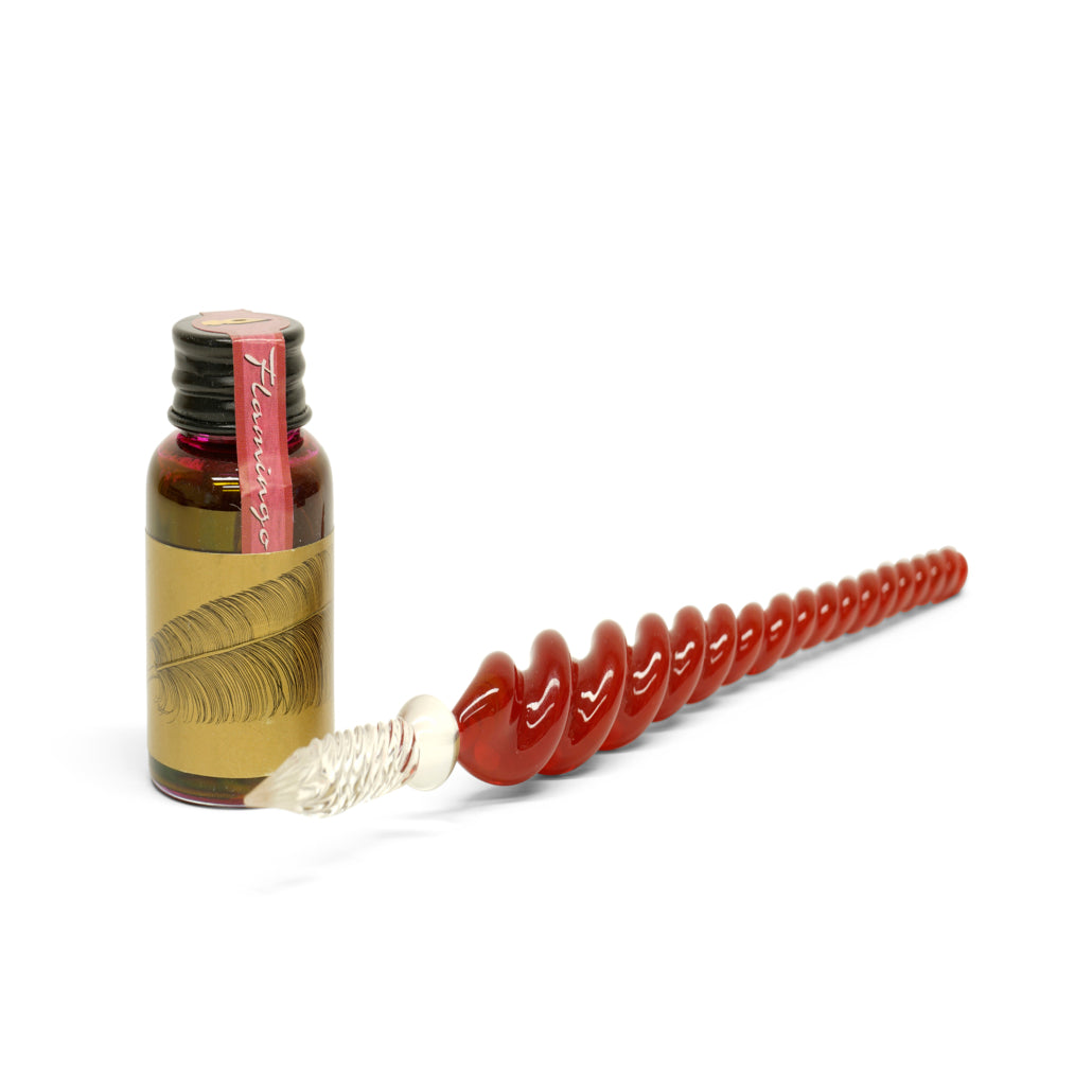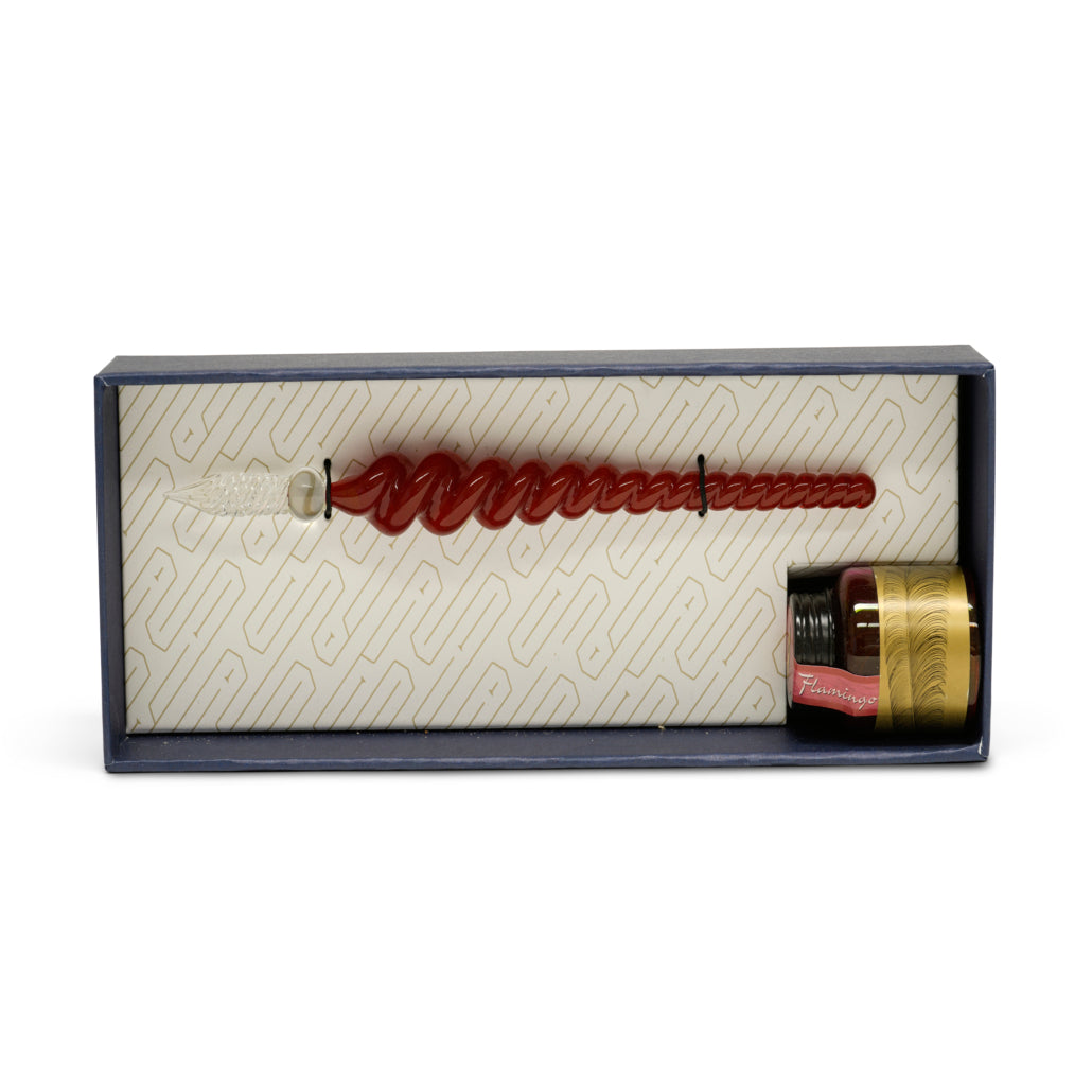 A handcrafted glass dip pen with a bold spiral design, inspired by Venetian artistry. Paired with a rich calligraphy ink, it makes a refined gift for writing lovers. Elegant and functional, it's a timeless desk accessory.
