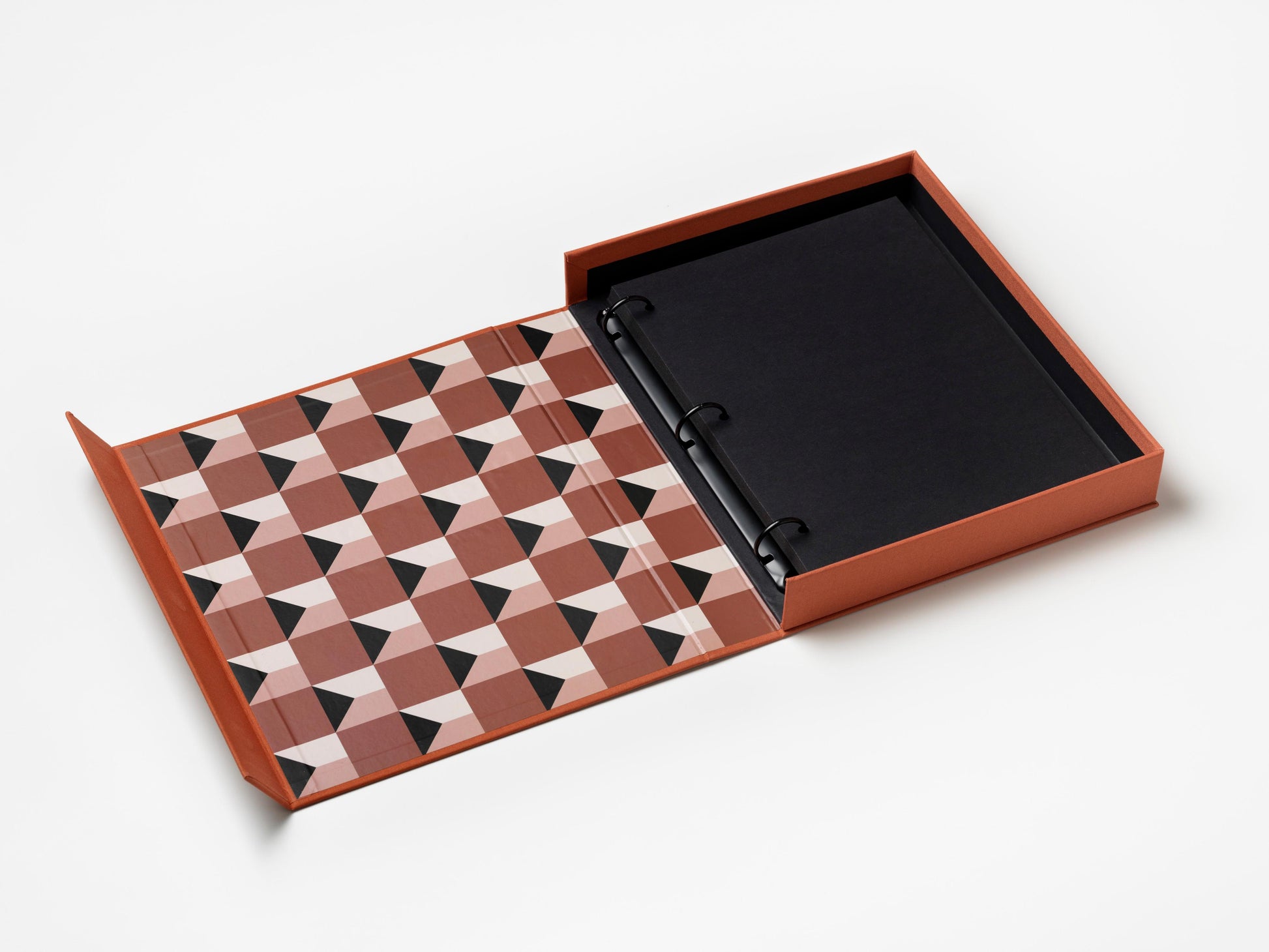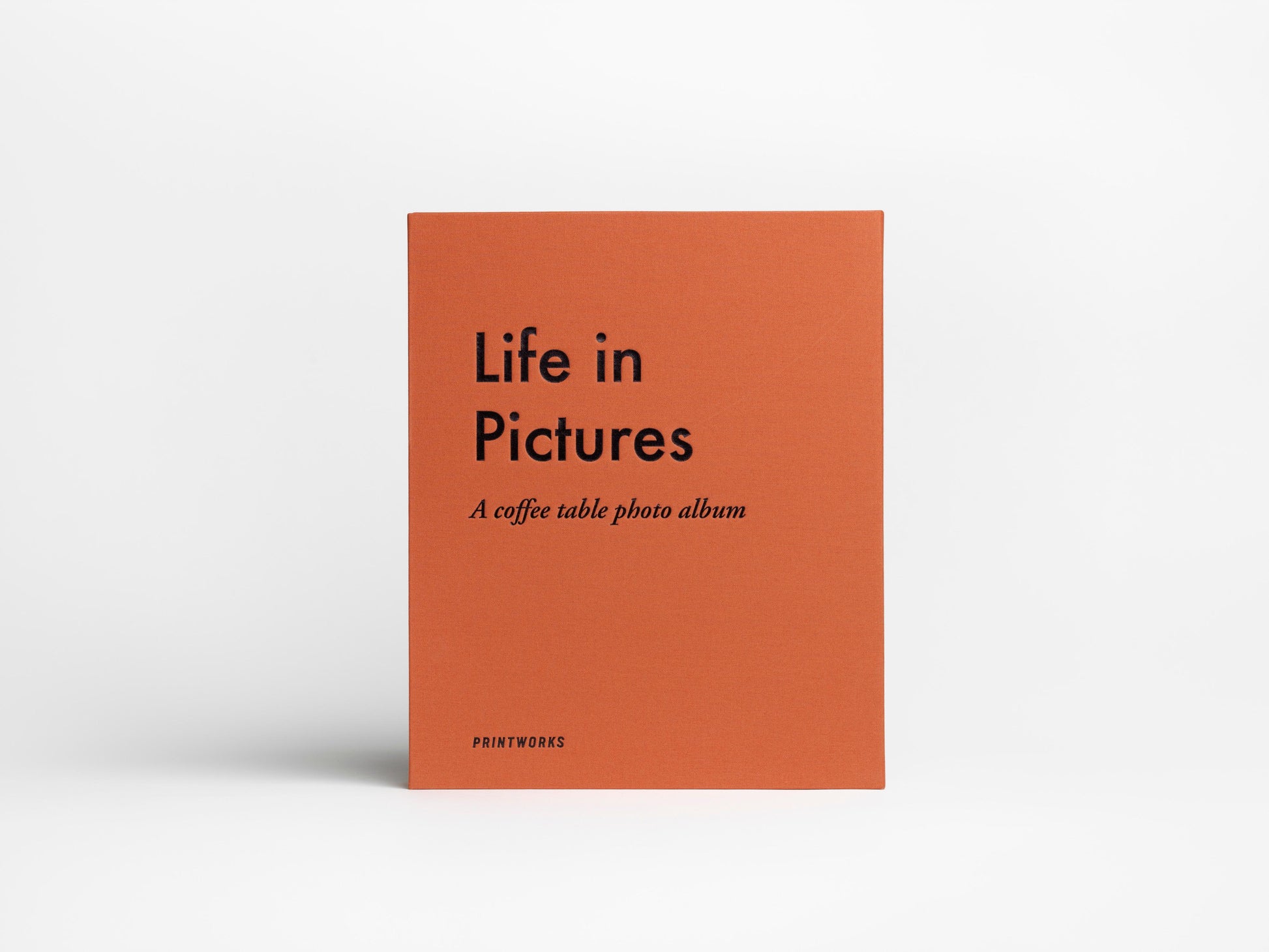 Discover our Life in Pictures coffee table photo album, featuring an elegant terracotta cloth cover with black text.