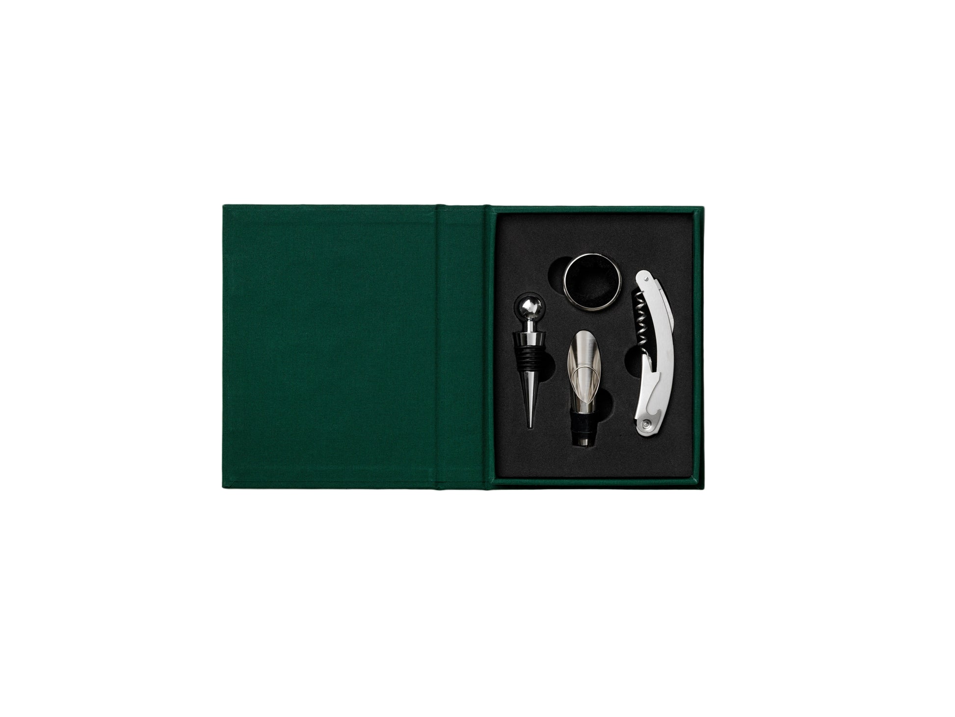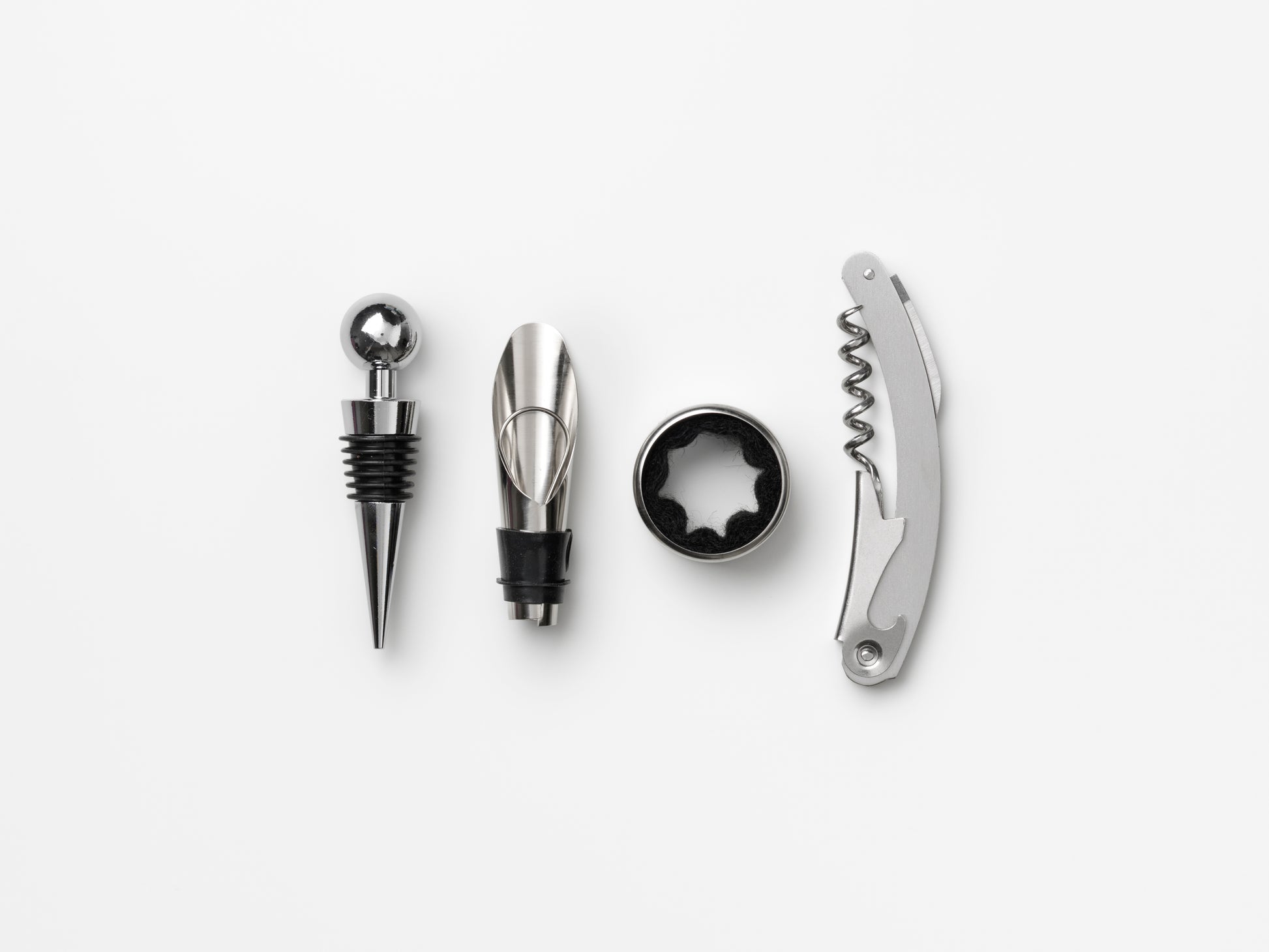 Discover the essential kit for perfecting your wine experience - a refined toolbox in an elegant book-like box that makes the perfect going-away gift. Inside, you'll find an opener, stopper, pourer, and collar, each serving as essential tools in wine appreciation. All products are made of stainless steel and are dishwasher safe.