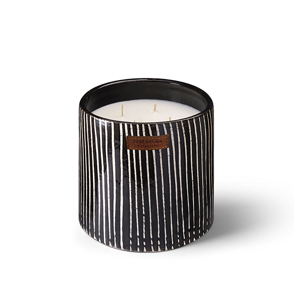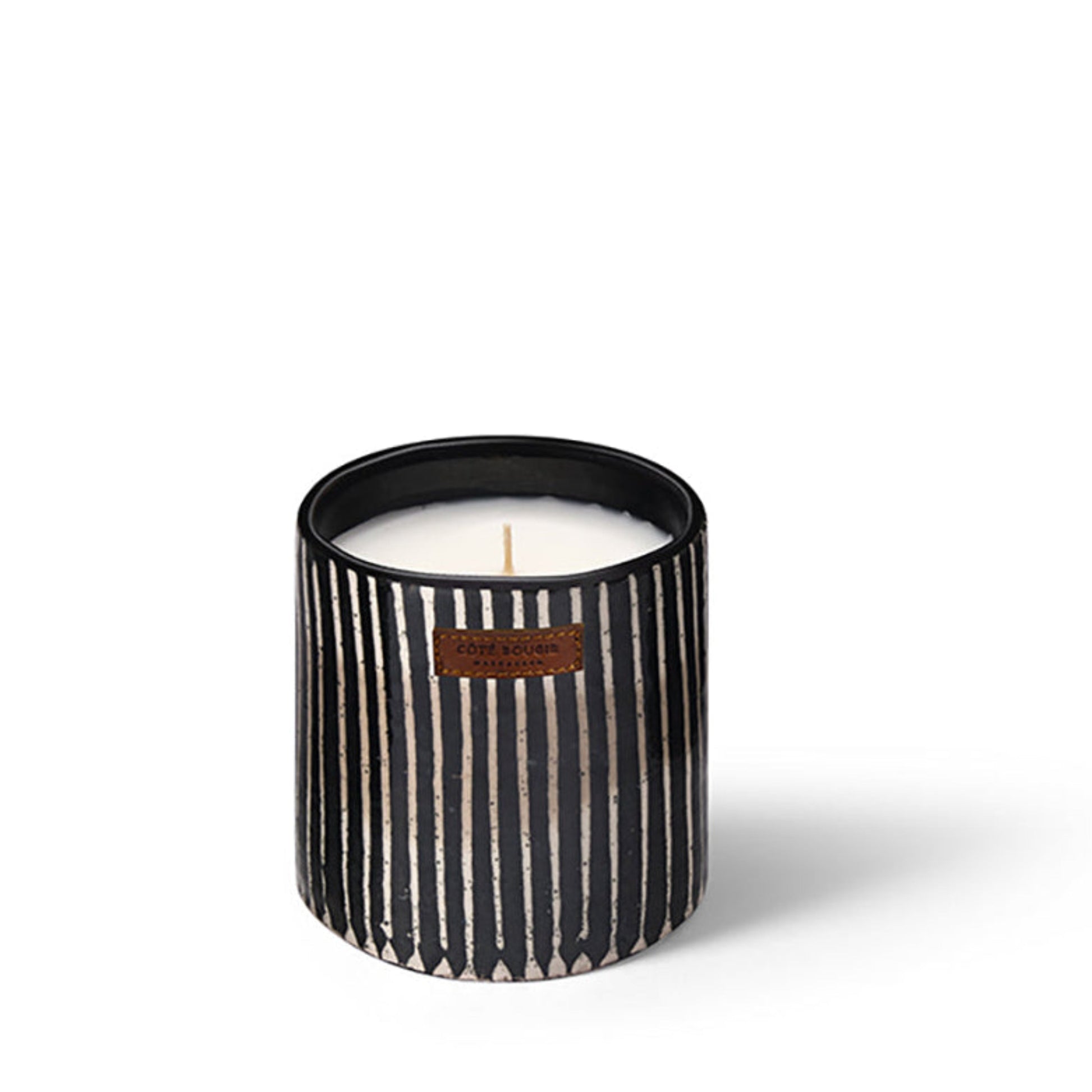 Scented candle in a black ceramic jar with hand-painted white stripes, crafted in Marrakech. A bold and refined design piece.